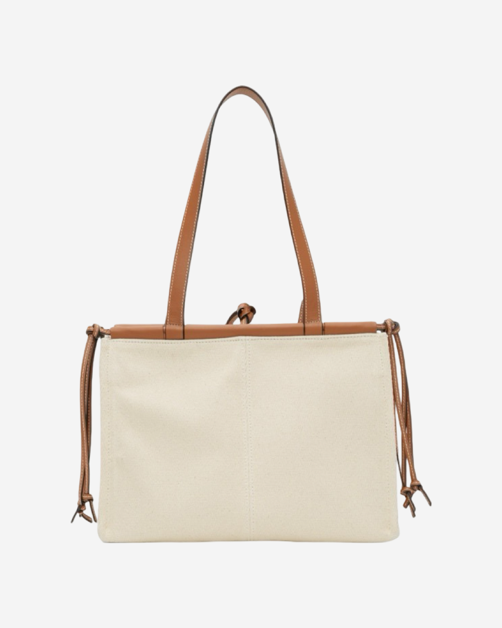 • Descripción: Bolsa Tote con align y detalles en piel color camel, doble asa fija, detalle de logo bordado, abertura principal abierta