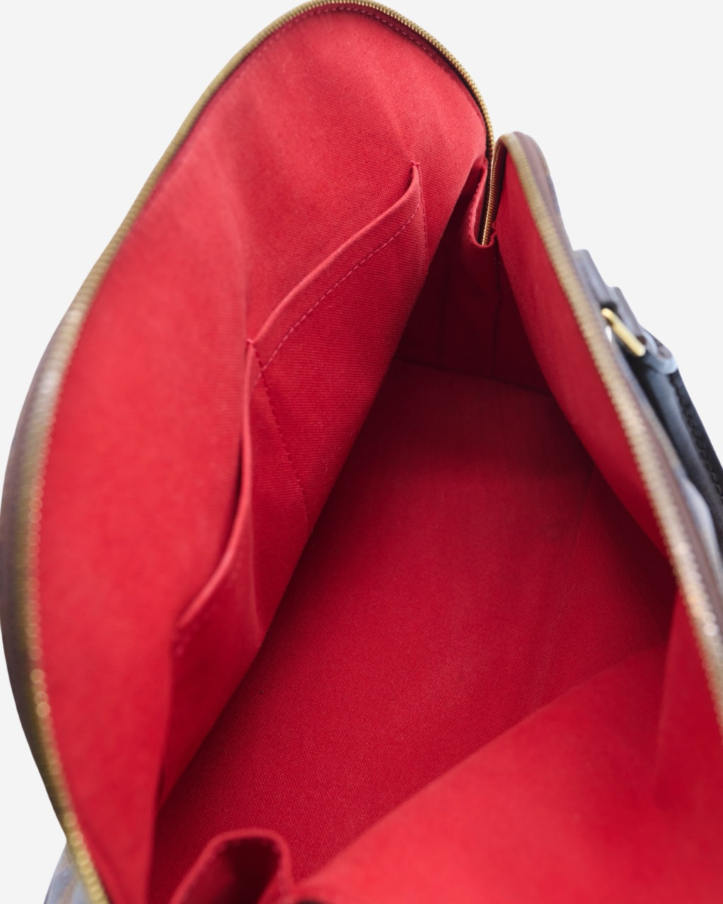 - Descripción: Bolsa de mano Louis Vuitton en canvas damier ebene, doble asa fija, abertura principal con cierre de doble sentido, forro interior textil color rojo con bolsillos, hardware en tono dorado