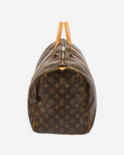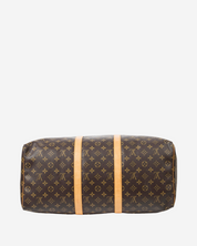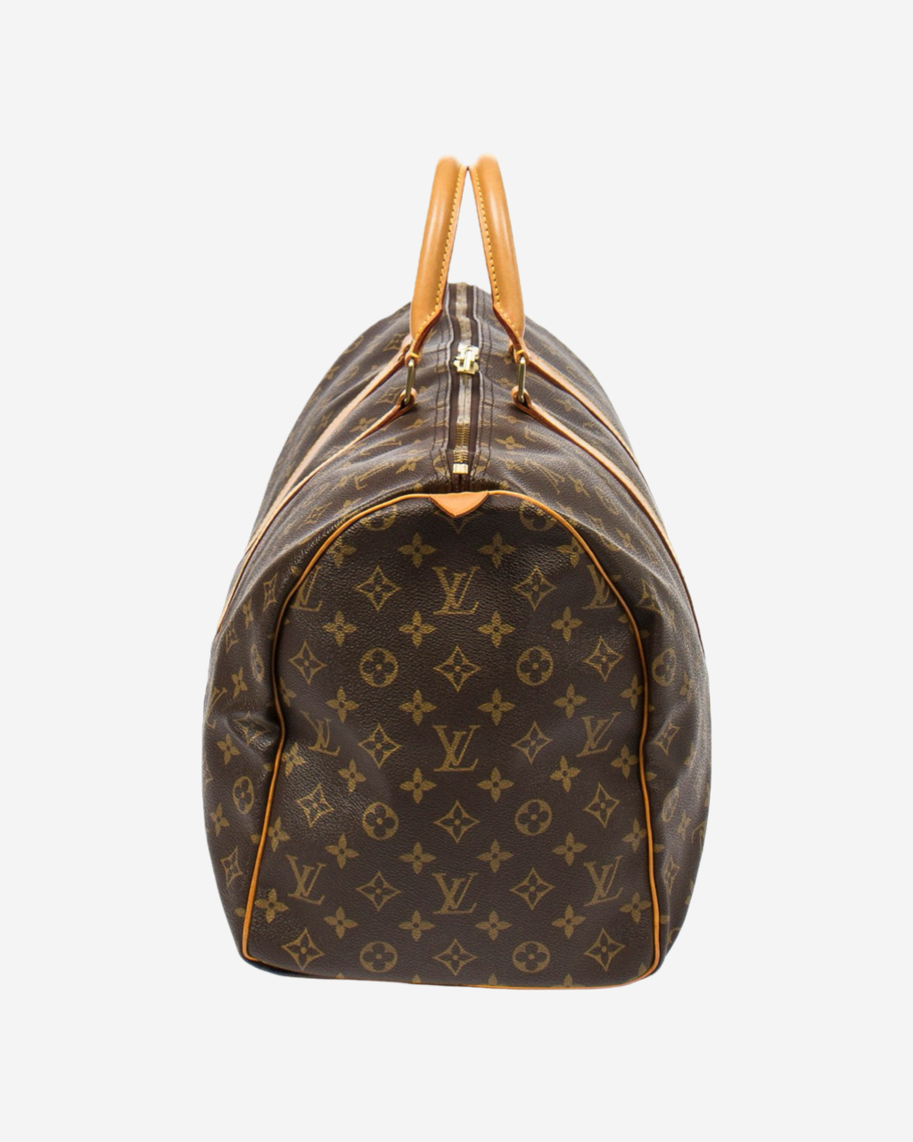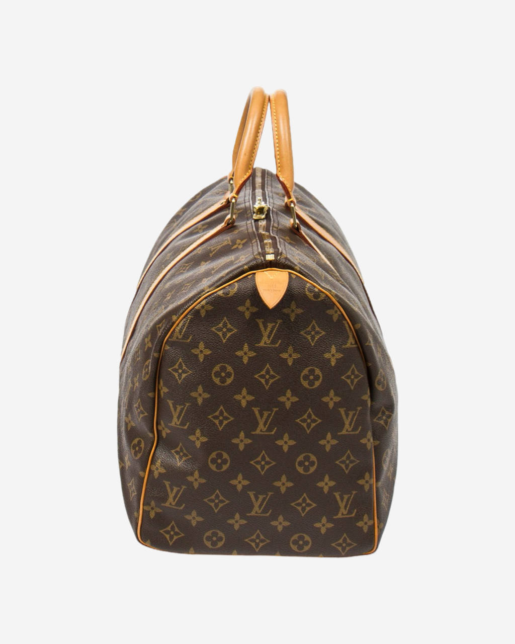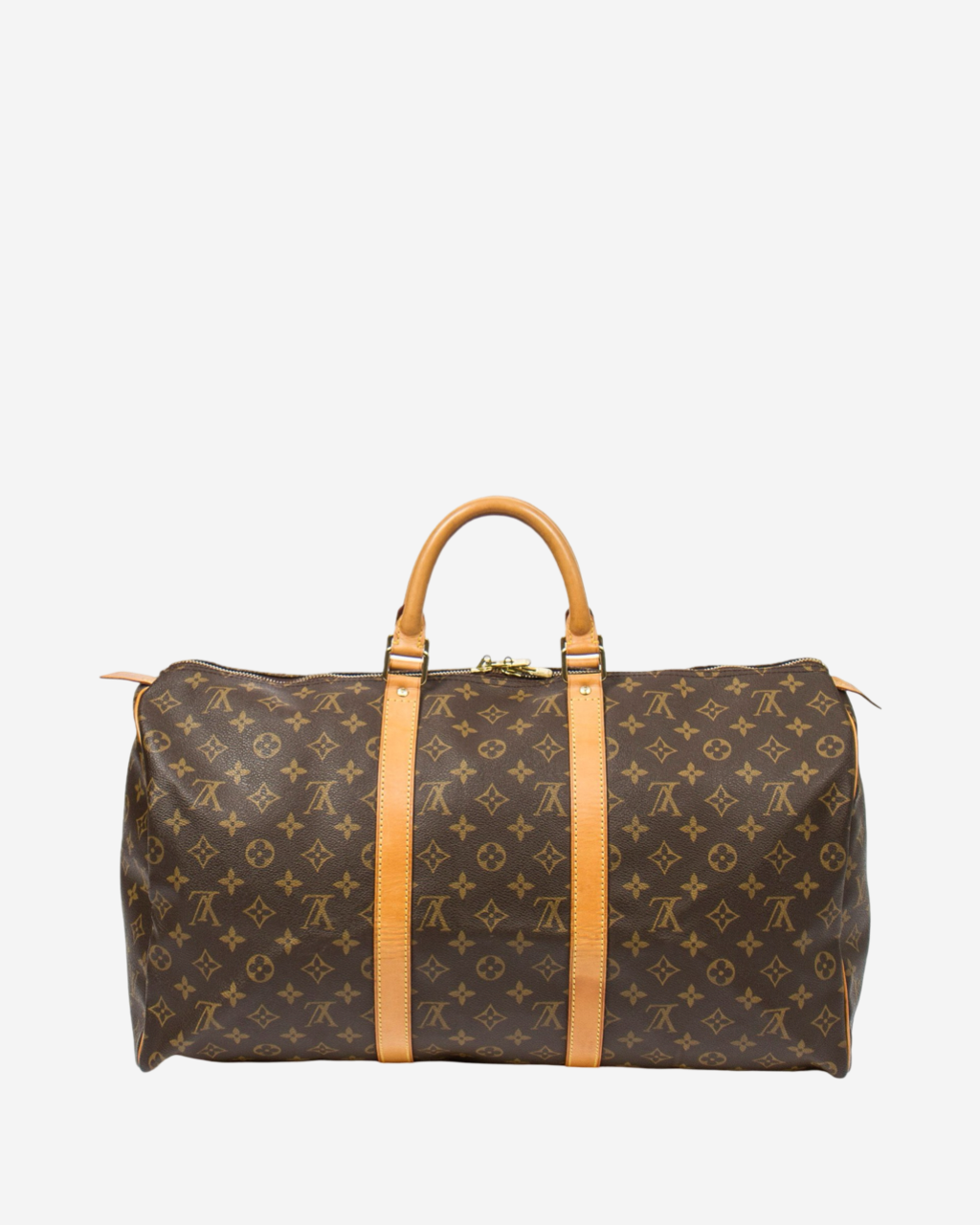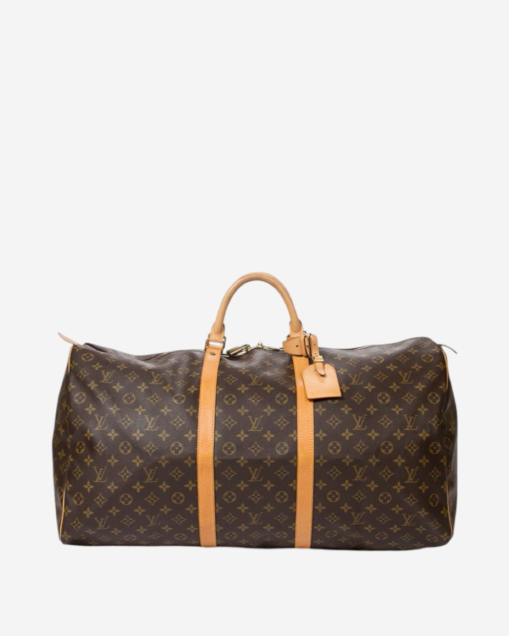 - Descripción: Bolso mano Keepall en piel, con dos asas fijas en la parte superior, cierre de doble sentido, compartimento principal, forro en canvas, color café hardware color dorado