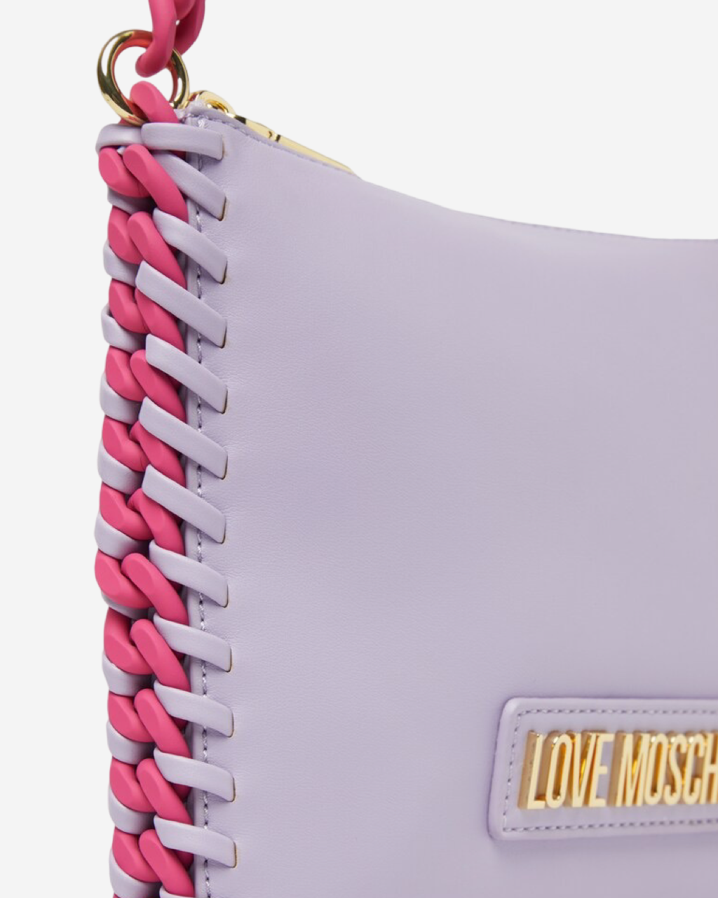 • Descripción: Bolsa de hombro en piel color morado, detalle de cadena en color rosa, asa fija, placa frontal, cierre al tope, hardware color plateado