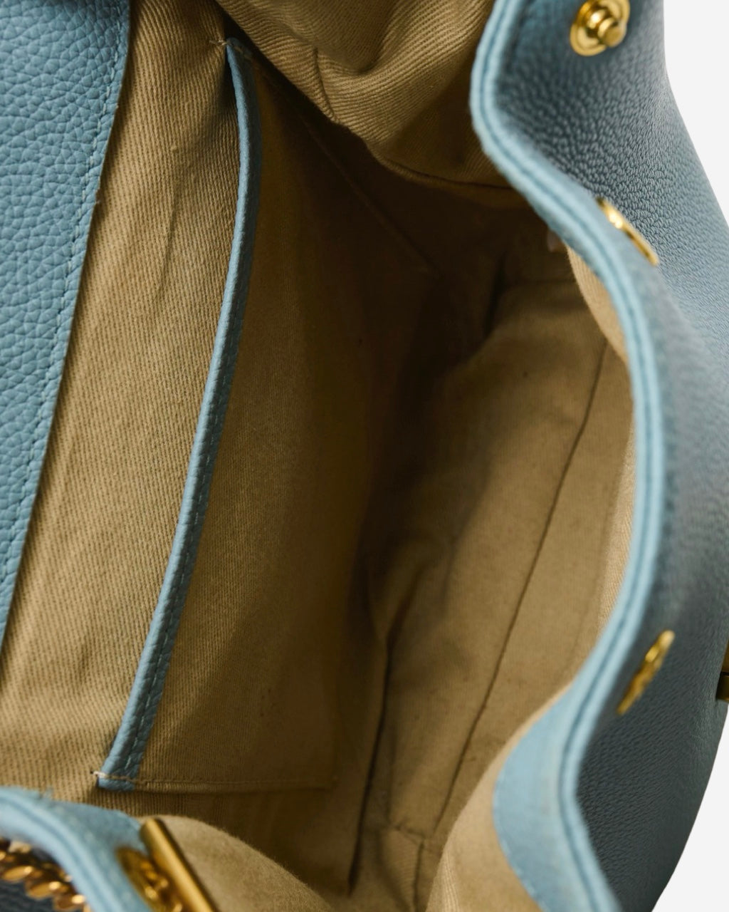 - Descripción: Bolsa de hombro en piel color azul, asa larga de cadena, abertura principal con solapa y broche metálico frontal grabado, forro interior textil color beige con bolsillo, hardware en tono dorado