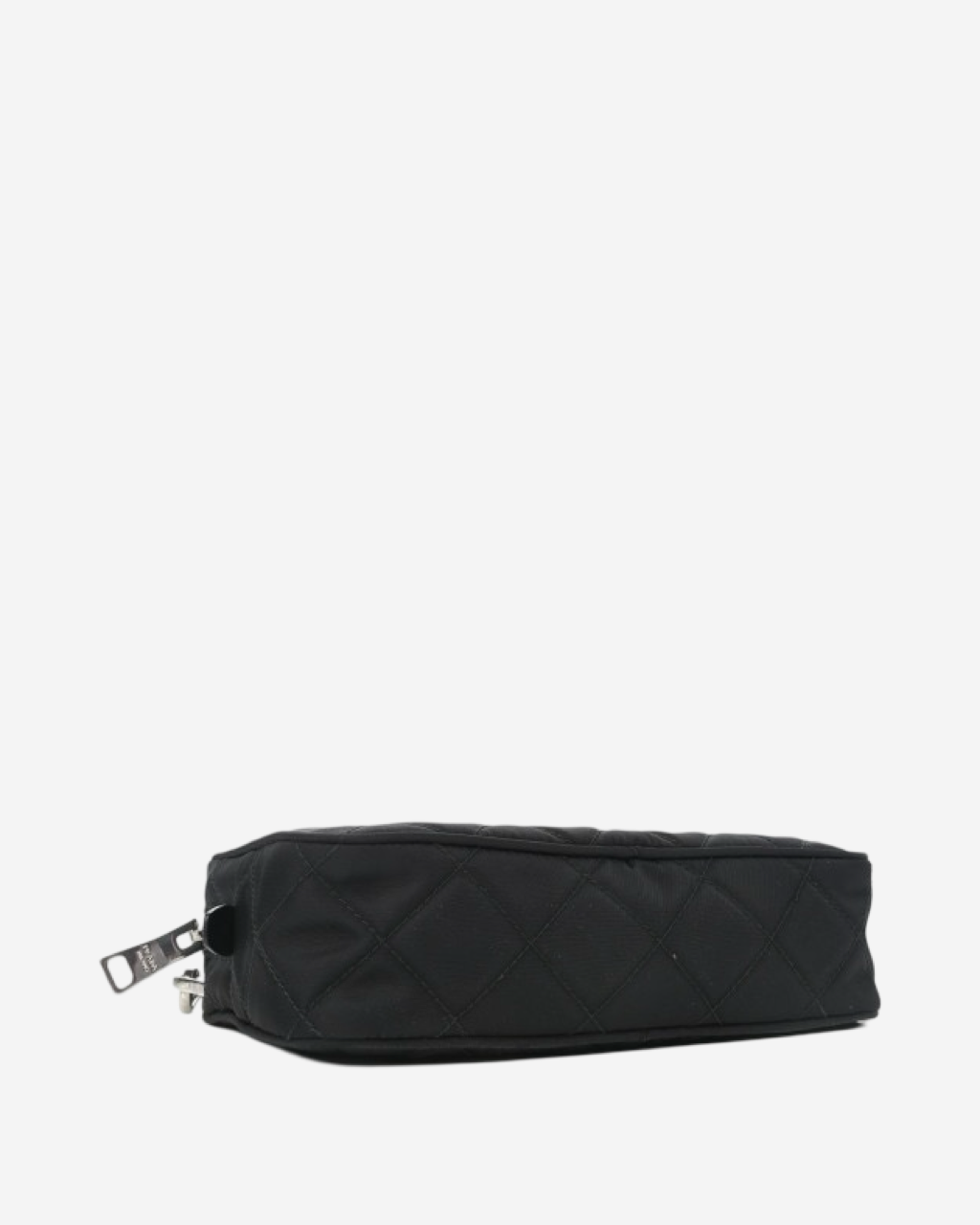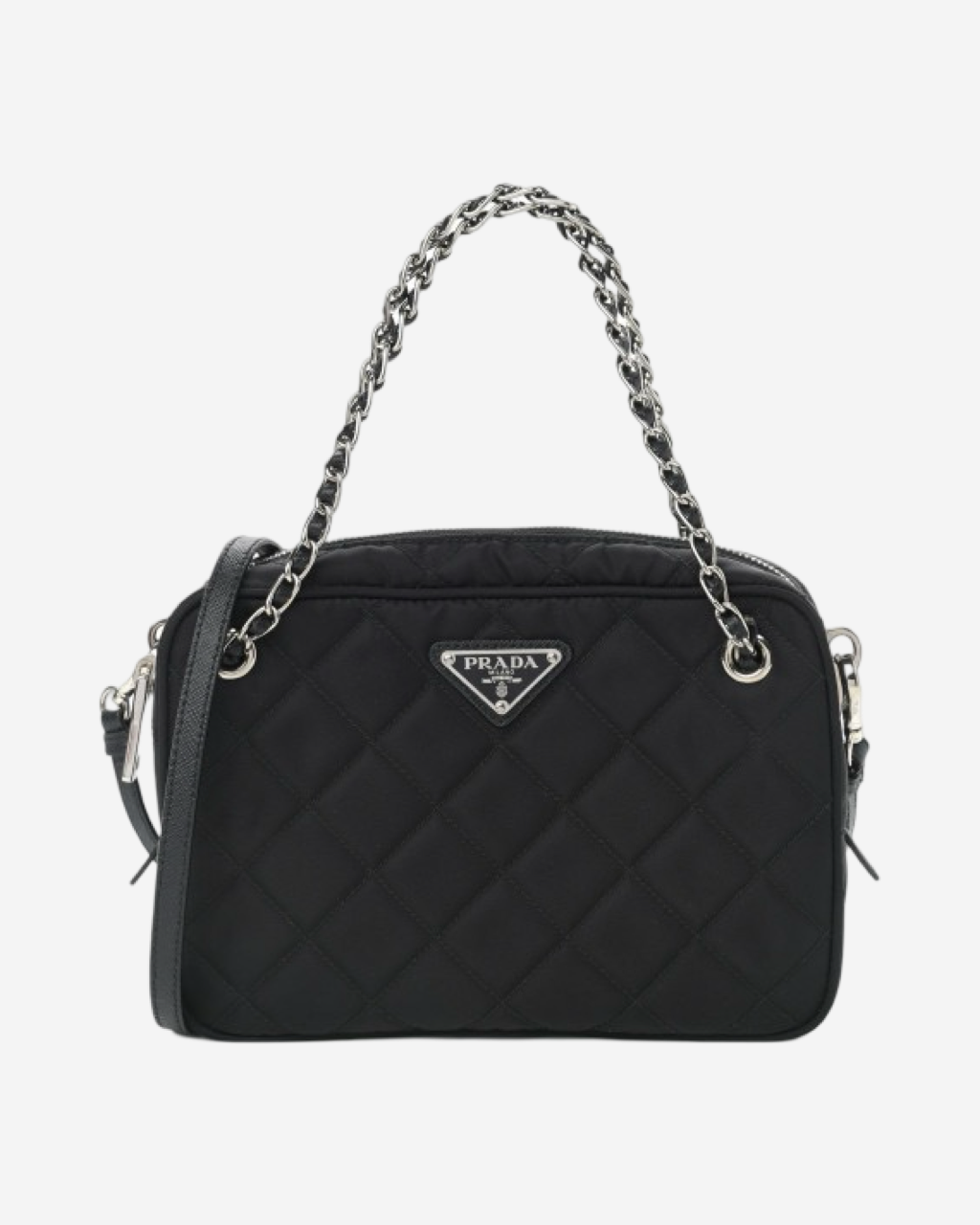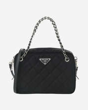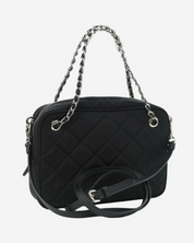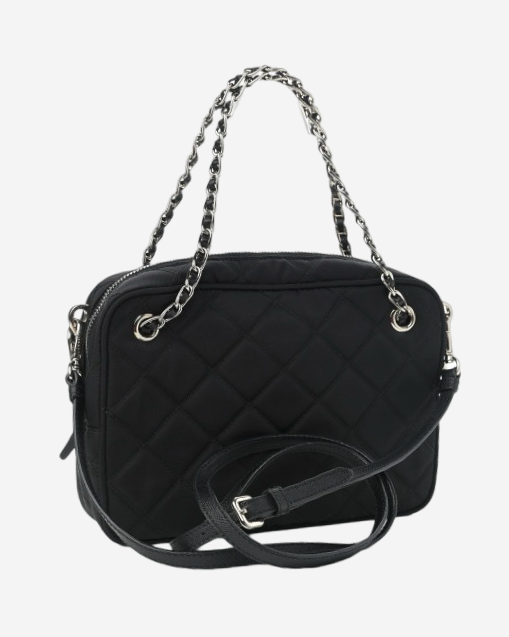 • Descripción: Bolsa cruzada en nylon color negro, placa característica frontal, cierre al tope, asa movible de cadena con piel, hardware color plateado