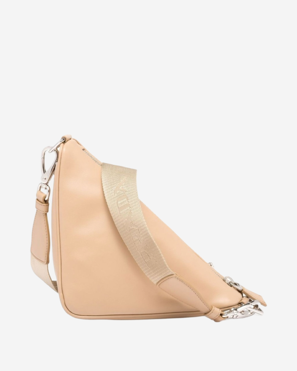 - Descripción: Bolsa en forma triangular, logo frontal, strap largo ajustable, hardware color plateado