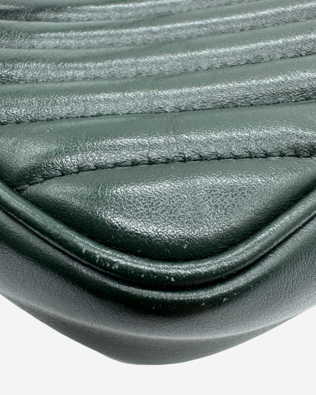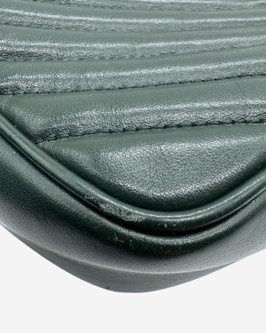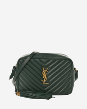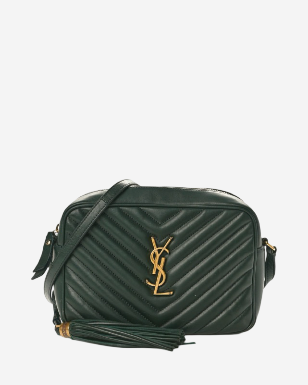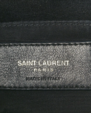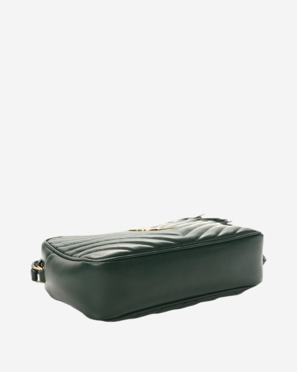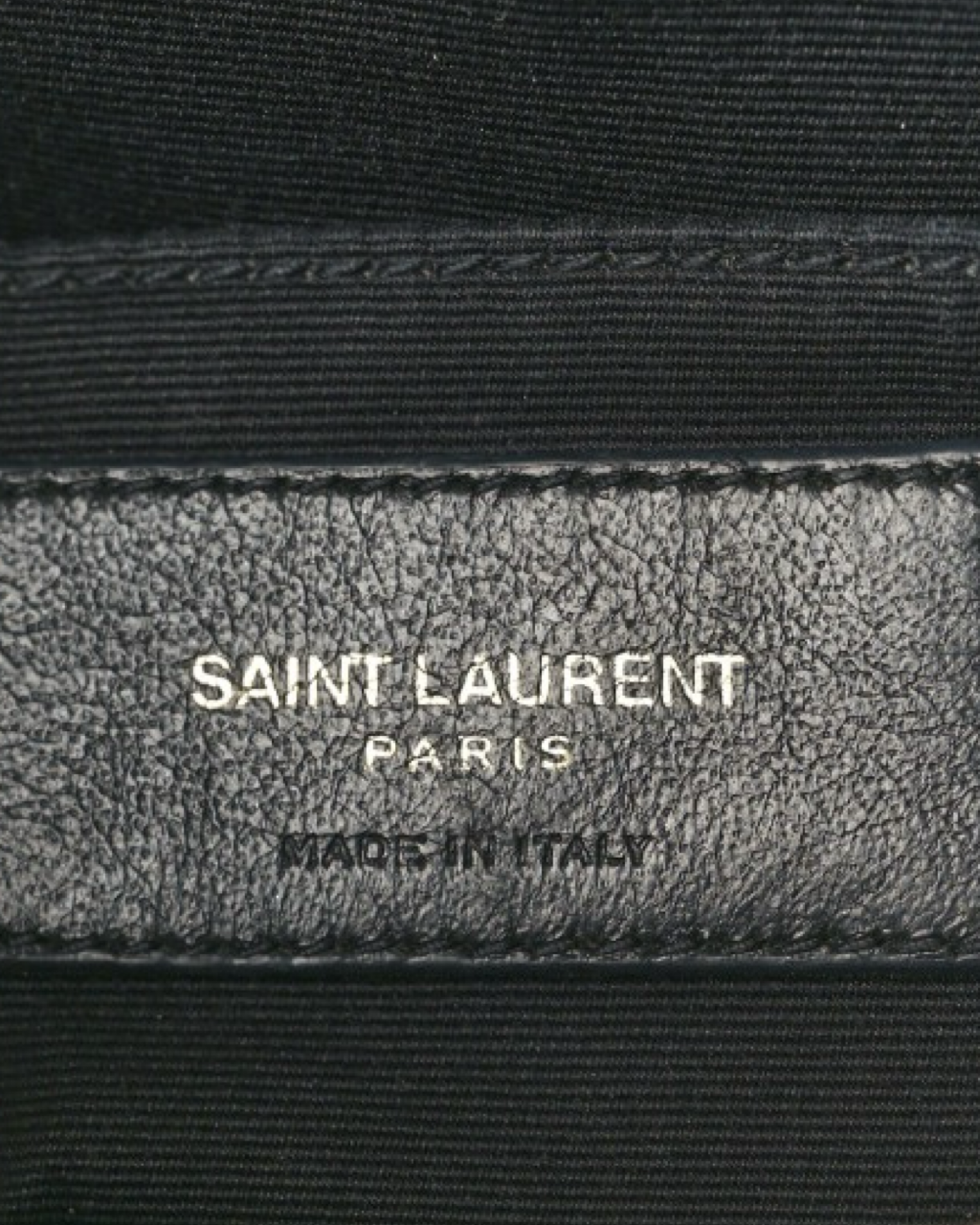 - Descripción: Bolso rectangular, con correa de cadena para usar de manera cruzada, hardware plateado, placa característica del logo YSL y detalle de borla grande