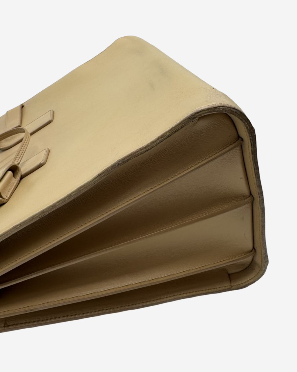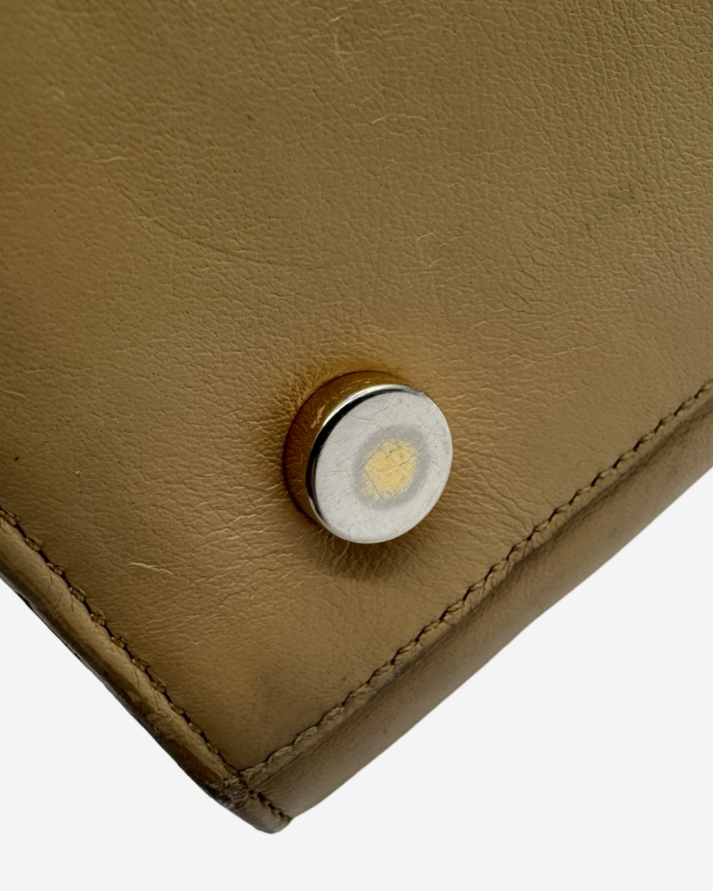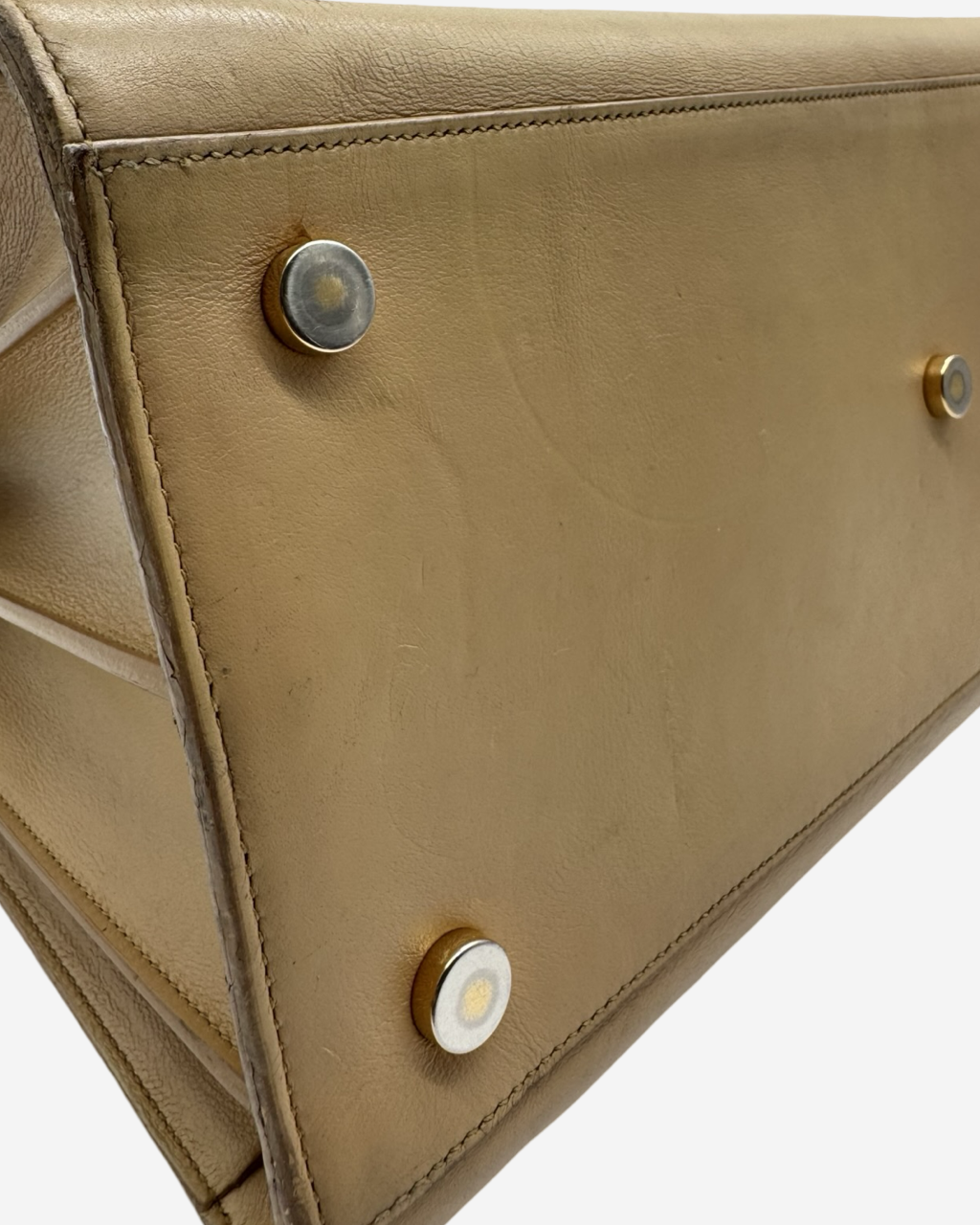 - Descripción: Bolsa de mano en piel, doble asa fija, logo grabado frontal, forro interior textil con bolsillos interiores, hardware color dorado