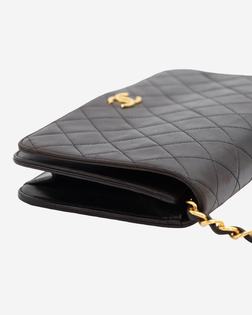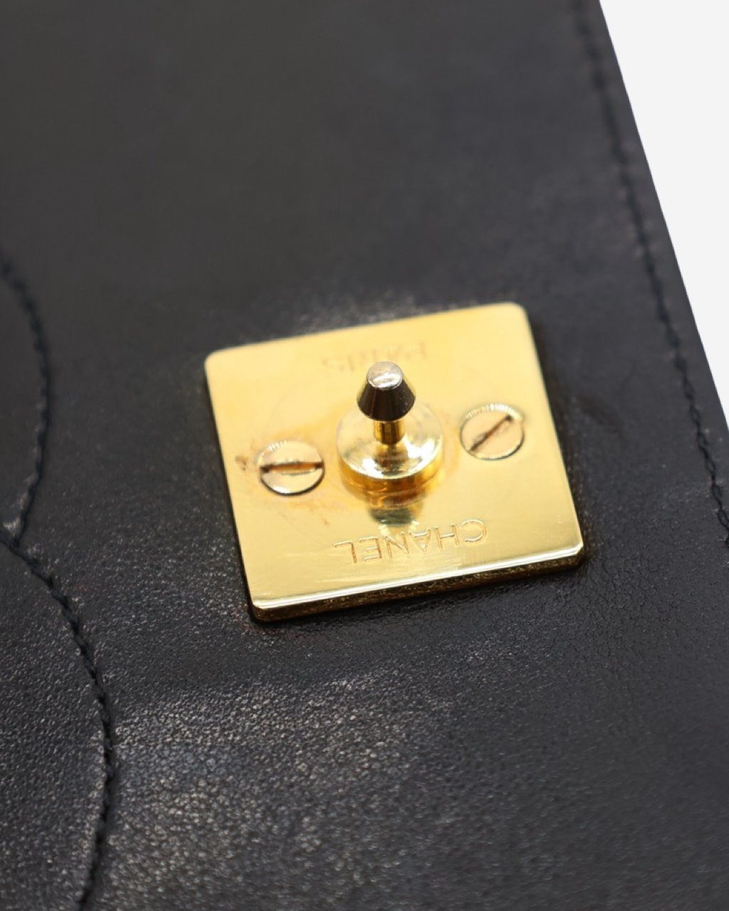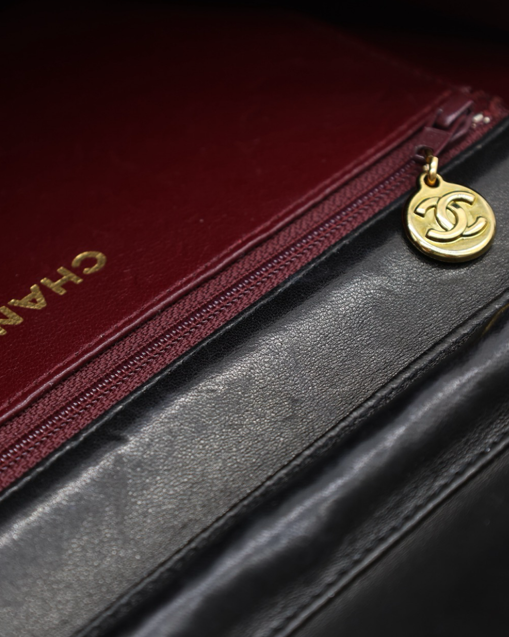 - Descripción: Bolsa de hombro en piel negro, broche CC en baño de oro de 24k, interior en color vino, hardware color dorado, logo CC frontal, abertura con solapa
