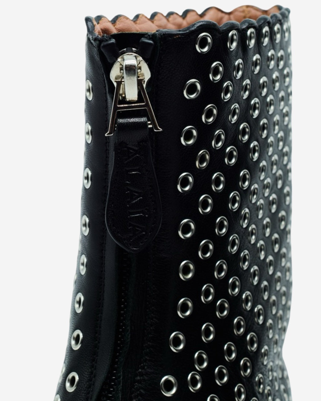 - Descripción: Botines Alaïa en piel color negro, puntera redonda, motivo de perforaciones, tacón alto, ajuste con cierre en la parte posterior, hardware en tono plateado