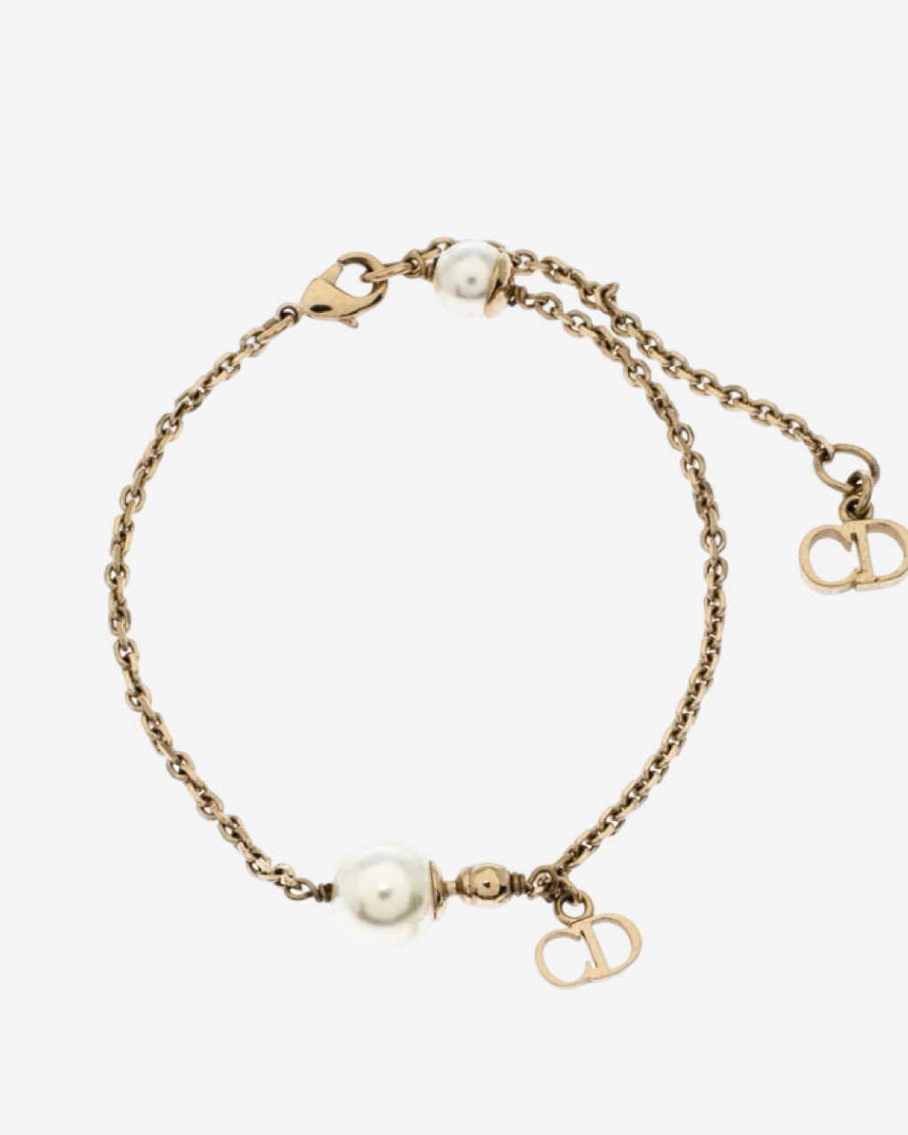 - Descripción: Brazalete en baño de oro de 24k con dijes de lojo CD, perlas, broche de langosta