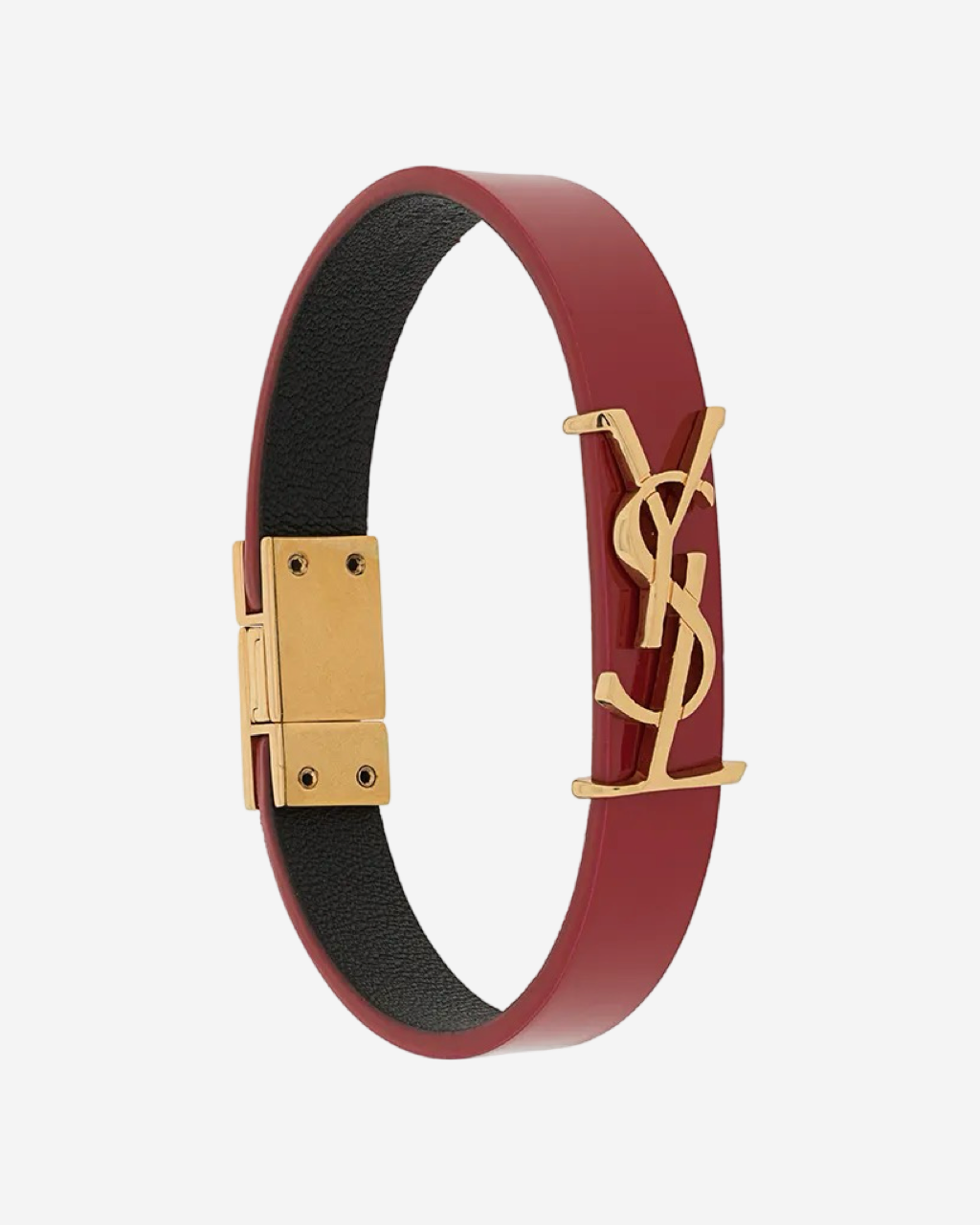 - Descripción: Brazalete en piel color rojo, logo cassandre característico, ajuste con broche, hardware en tono dorado