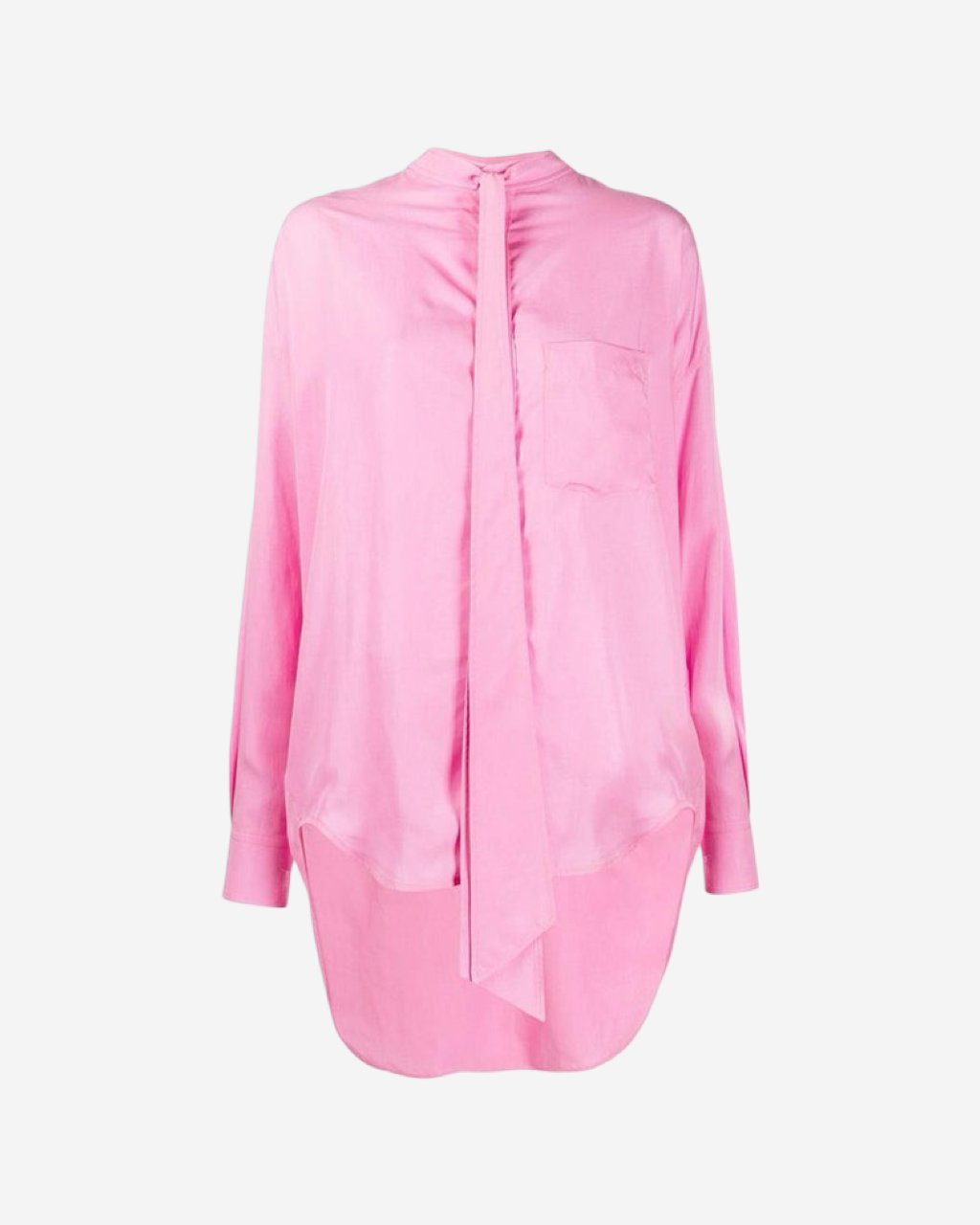 - Descripción: Camisa balenciaga en seda color rosa, cuello italiano con detalle de lazo, logo caracteristico en la parte de atras, manga larga