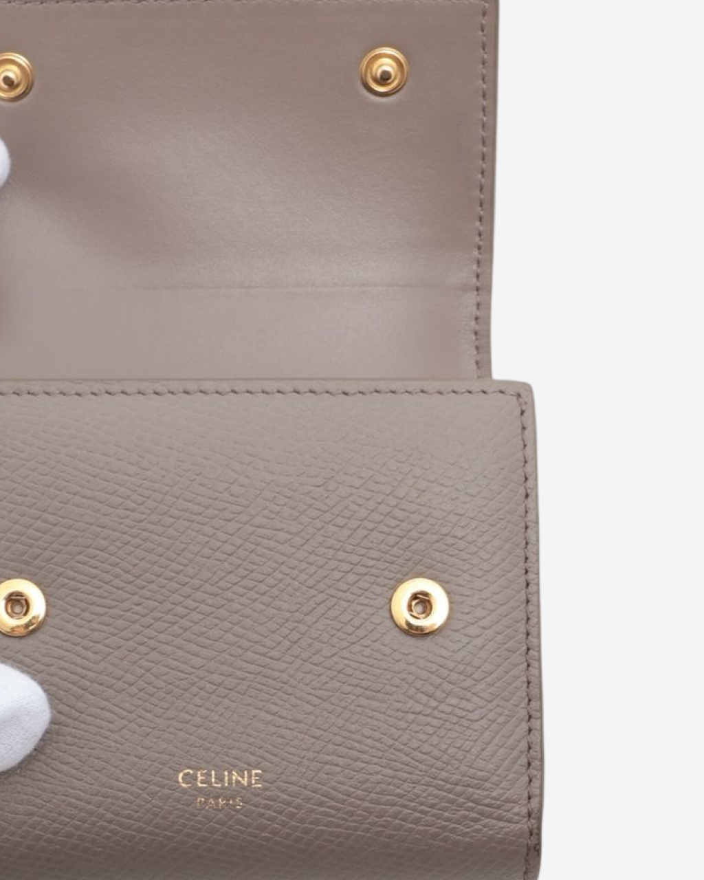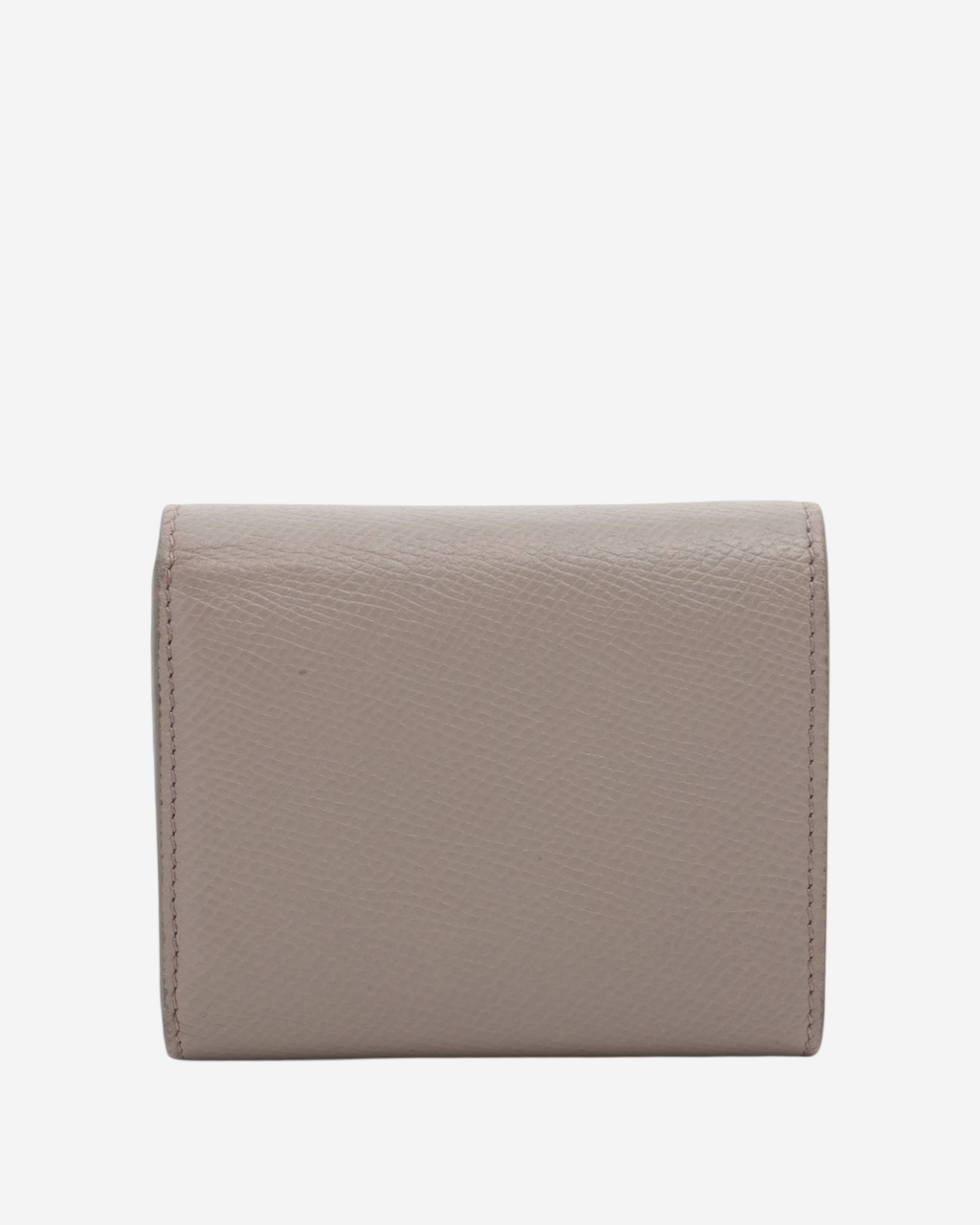 - Descripción: Cartera en piel, cierre frontal con botón de presión, compartimento principal para billetes y tarjetas, hardware color dorado