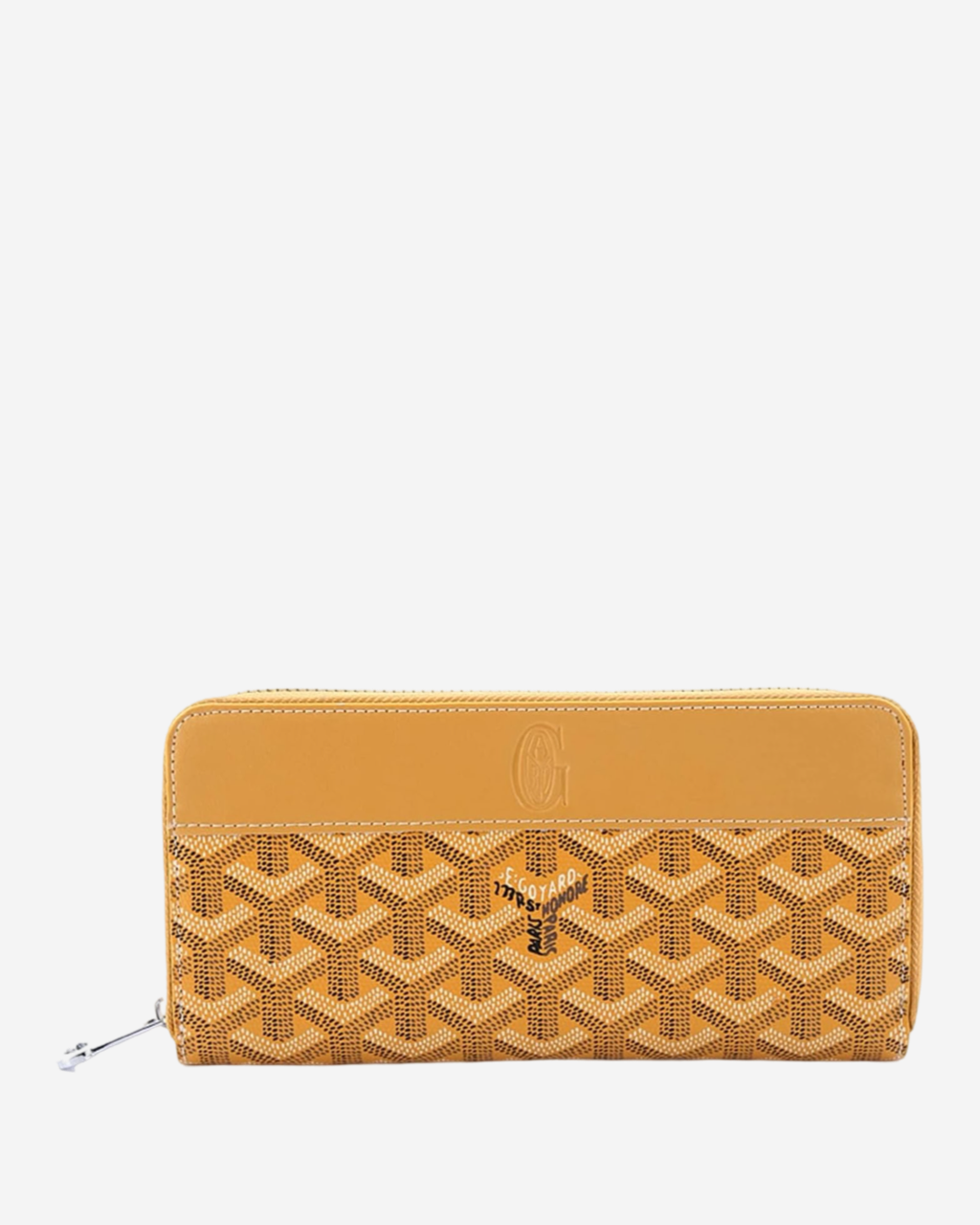 - Descripción: Cartera larga en piel color amarillo, cierre al tope, compartimentos para tarjetas y billetes, hardware color plateado