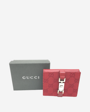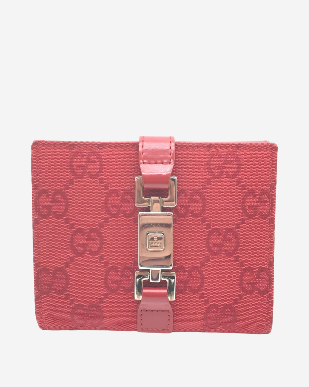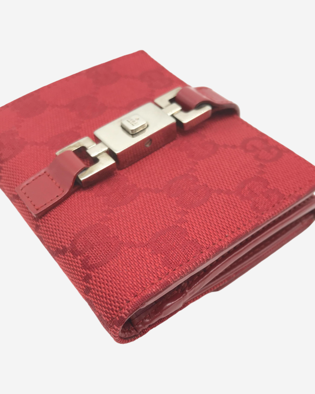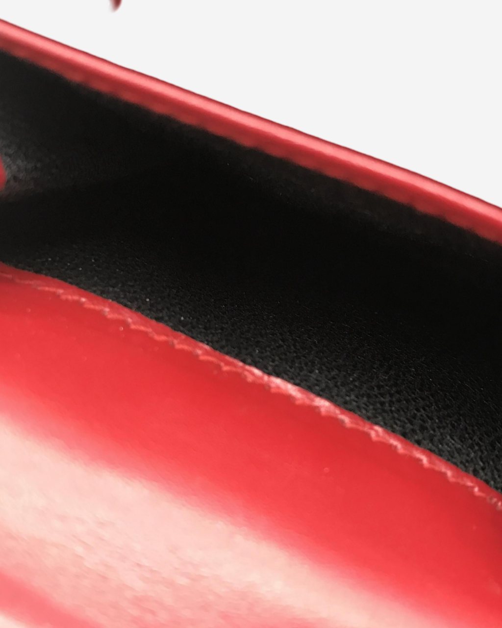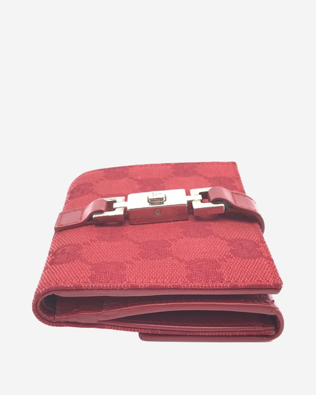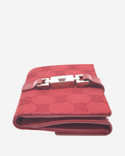 - Descripción: Cartera en piel color rojo, broche característico en color plateado, compartimento para billetes y monedas, hardware color plateado