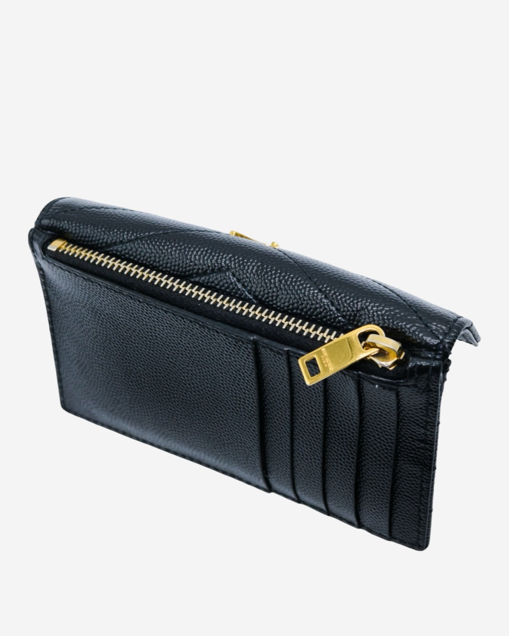 - Descripción: Cartera Saint Laurent en piel color negro, placa metálica Cassandre característica, abertura con broche metálico a presión, cierre de doble sentido, forro interior textil, hardware en tono dorado