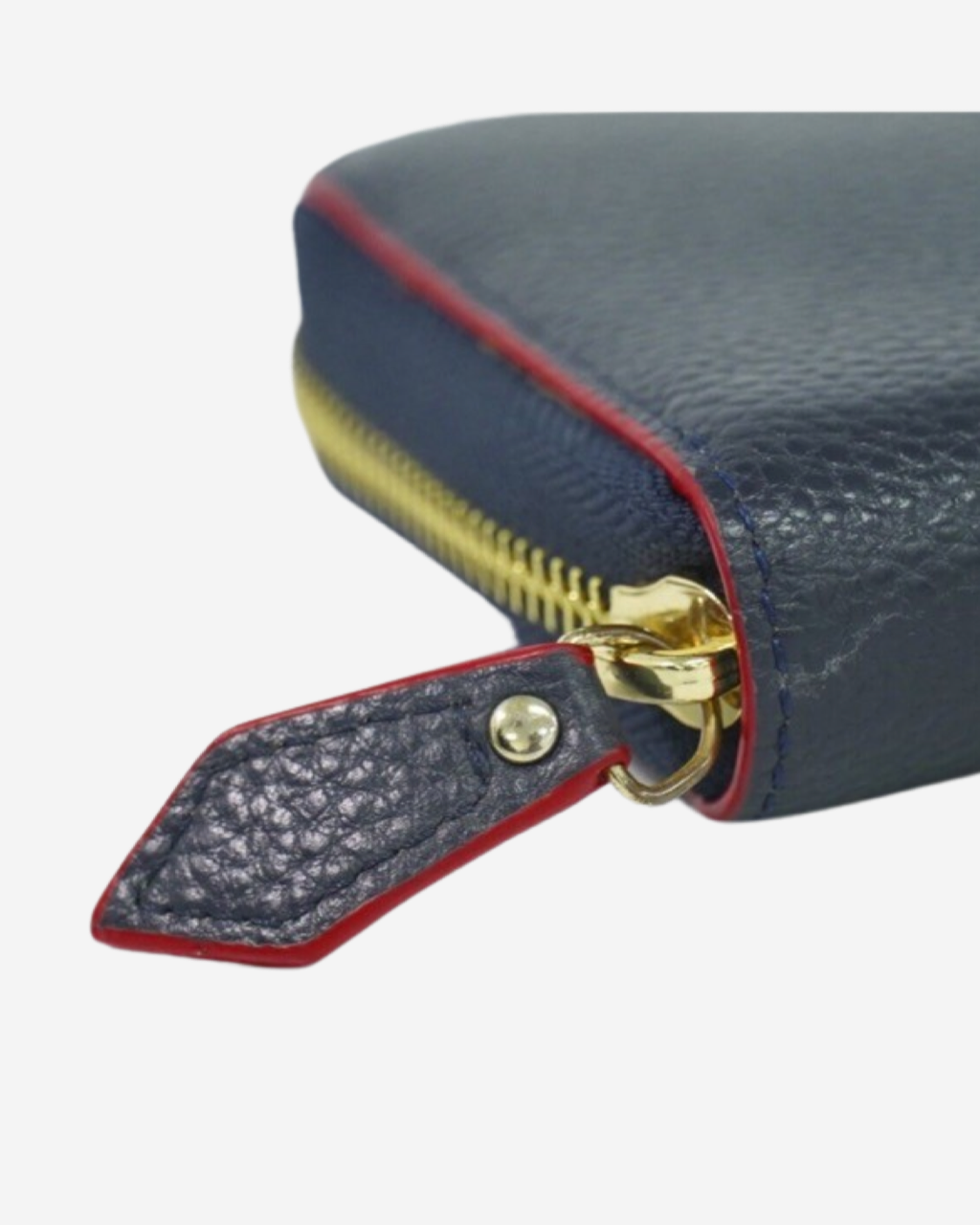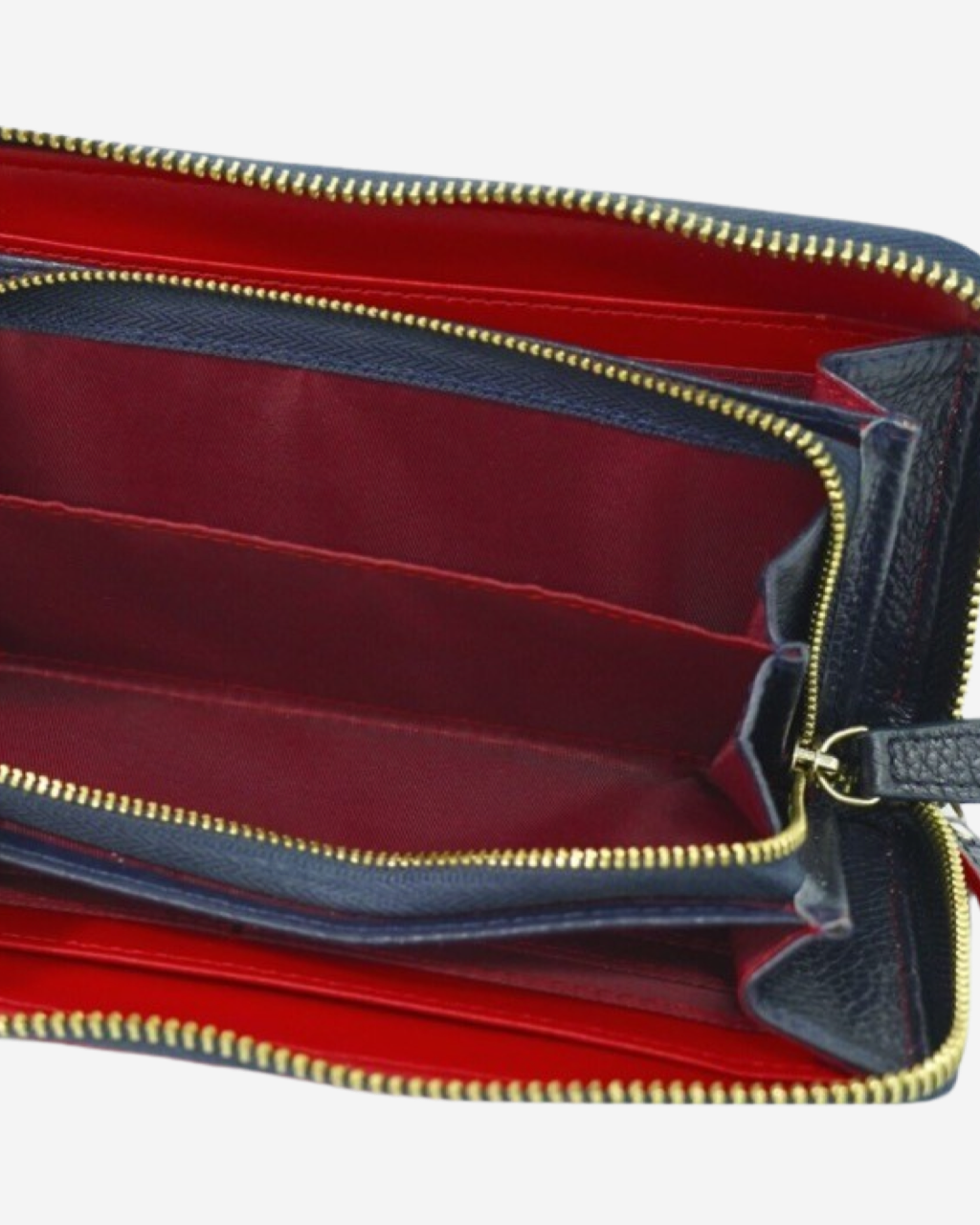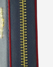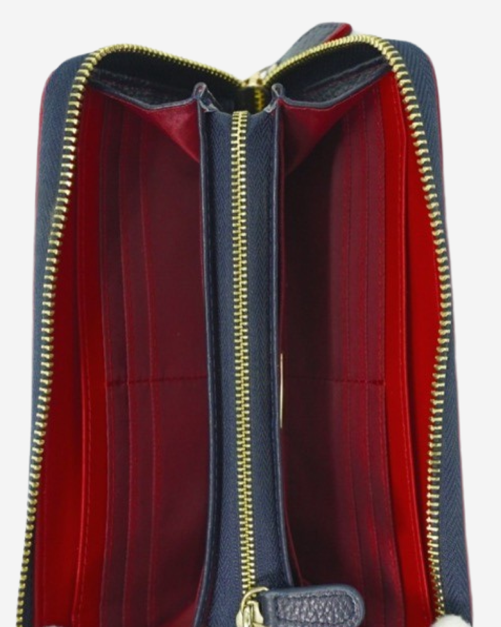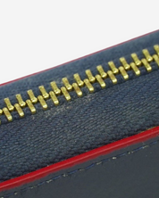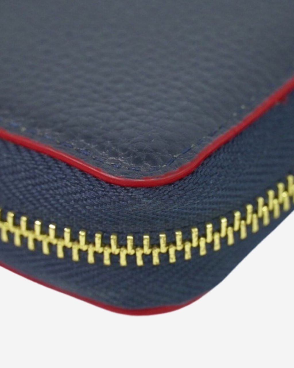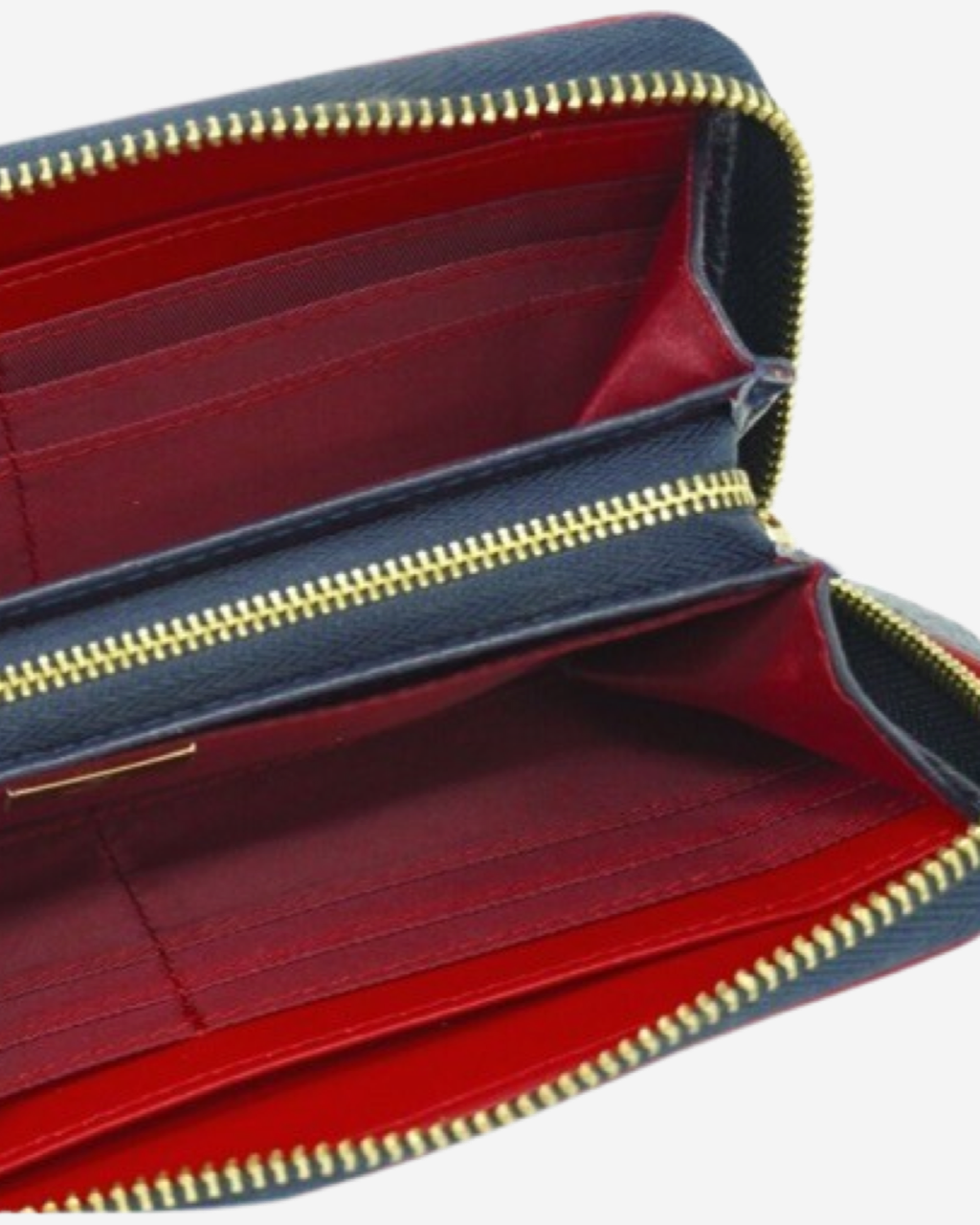• Descripción: Cartera en piel, logo característico al frente, cierre central con cremallera, interior color rojo con compartimiento para monedas, tarjetas y billetes.