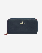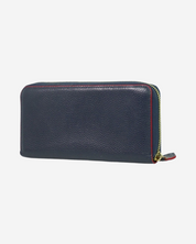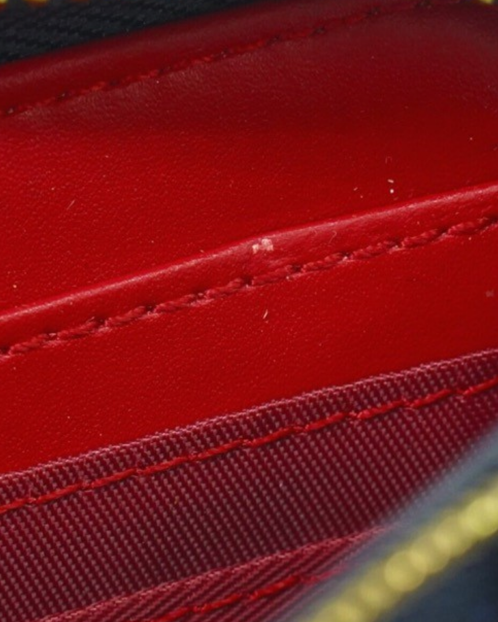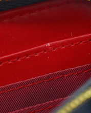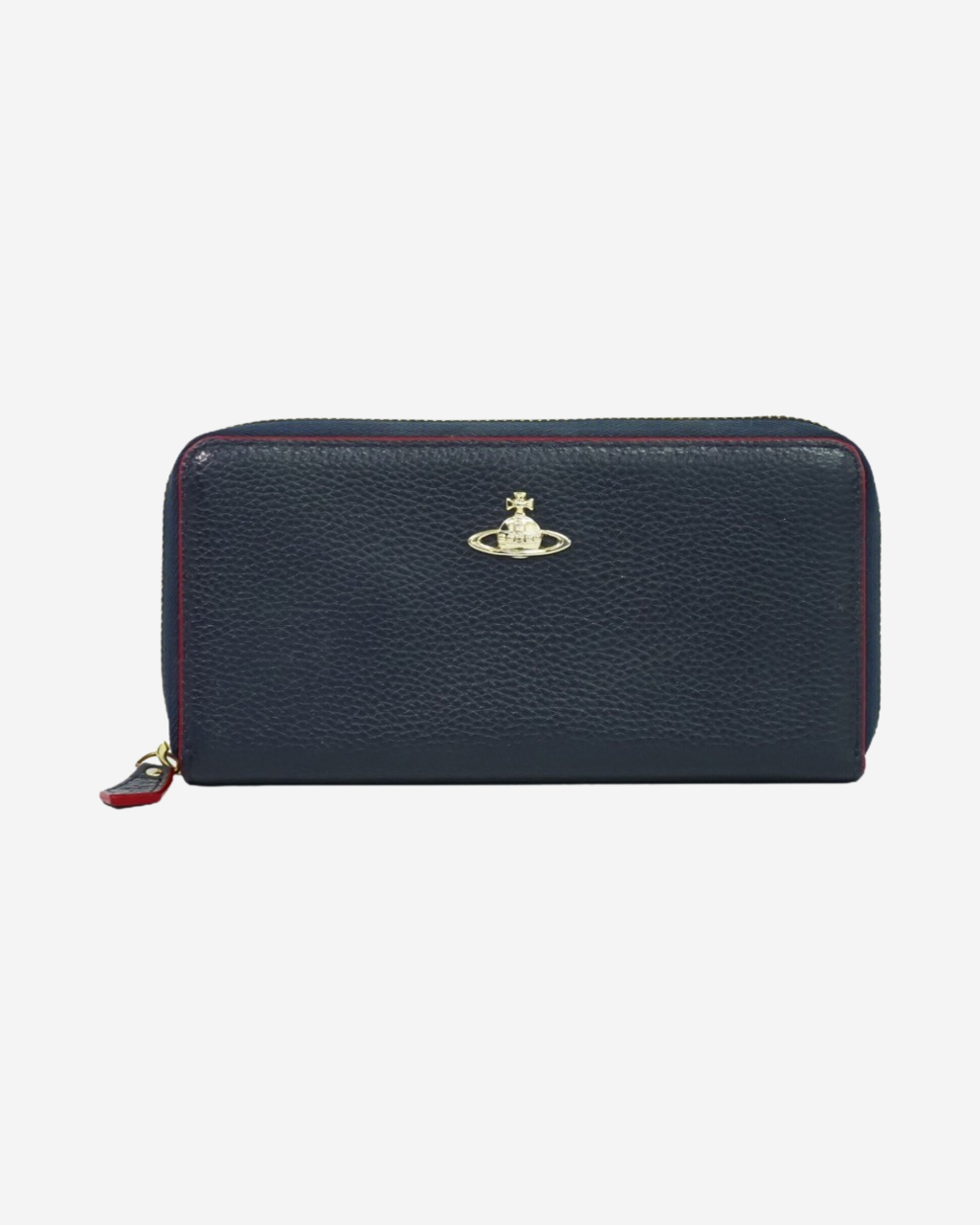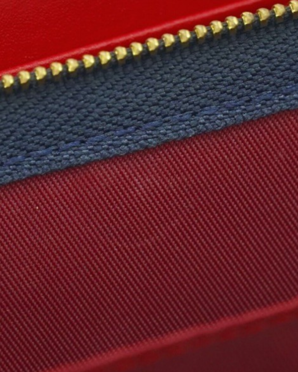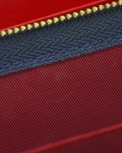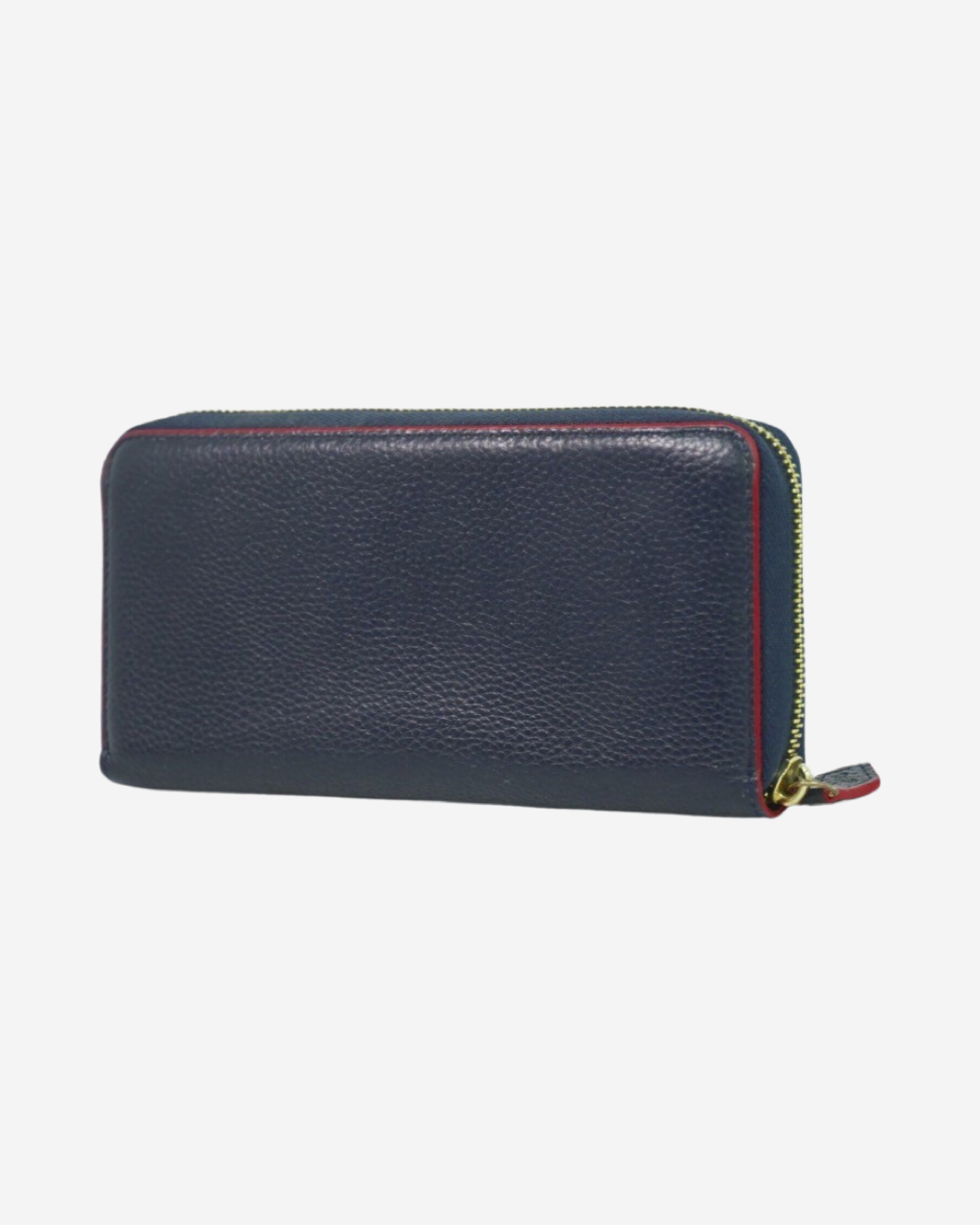 • Descripción: Cartera en piel, logo característico al frente, cierre central con cremallera, interior color rojo con compartimiento para monedas, tarjetas y billetes.