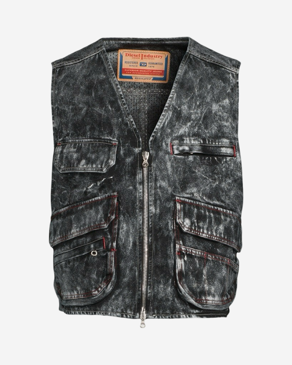 • Descripción: Chaleco Oversized en denim color gris desgastado, cuello en V, ajuste con zipper al frente