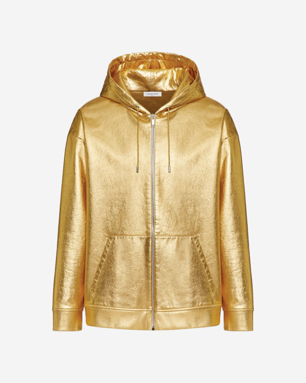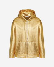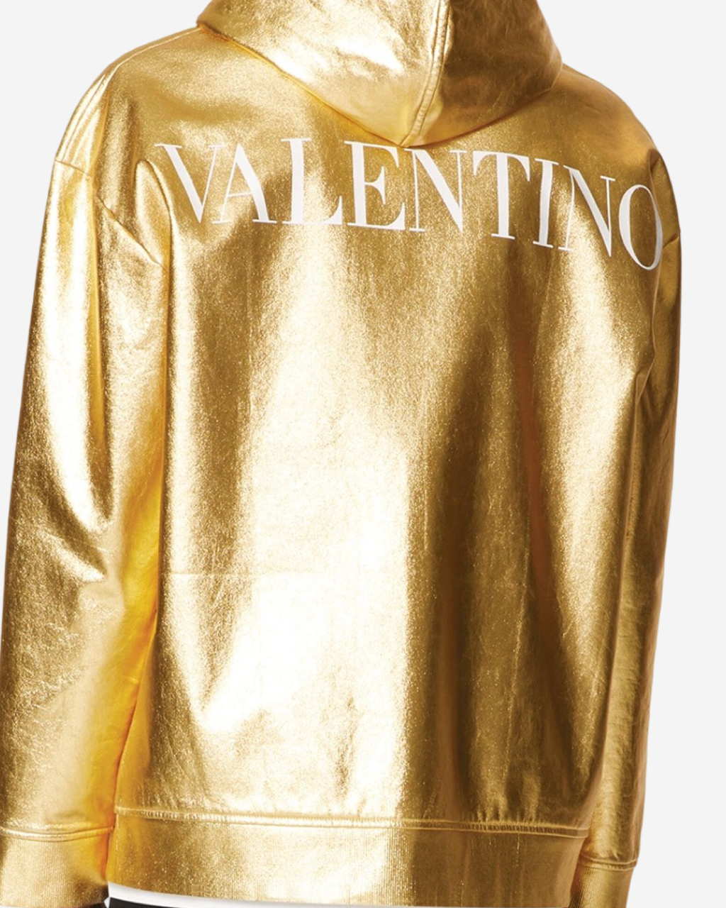 - Descripción: Chamarra con gorro Valentino en nylon color dorado, logo característico en blanco en la parte trasera, ajuste con zipper