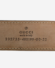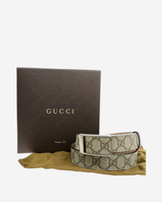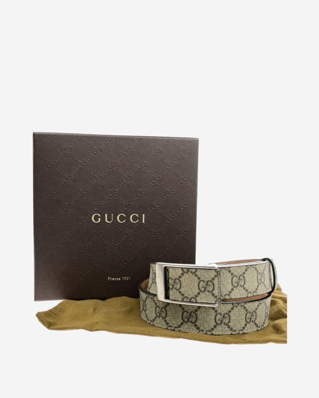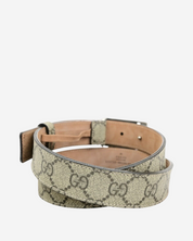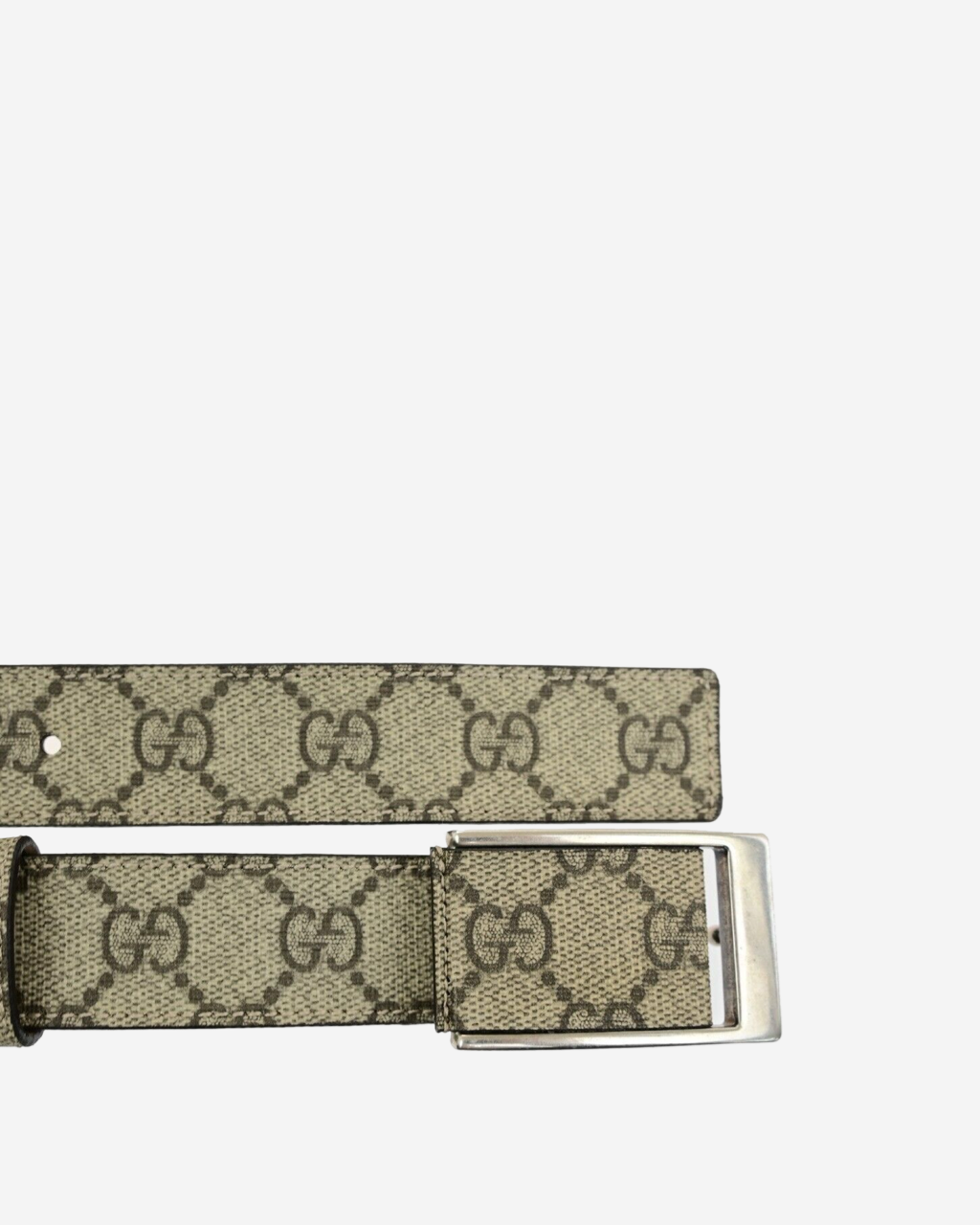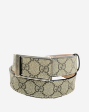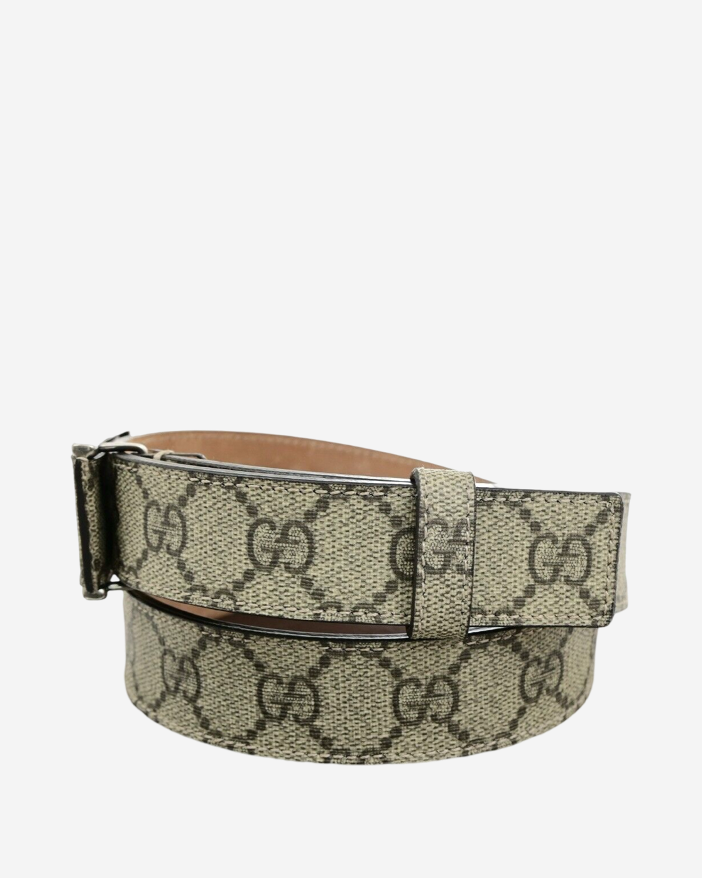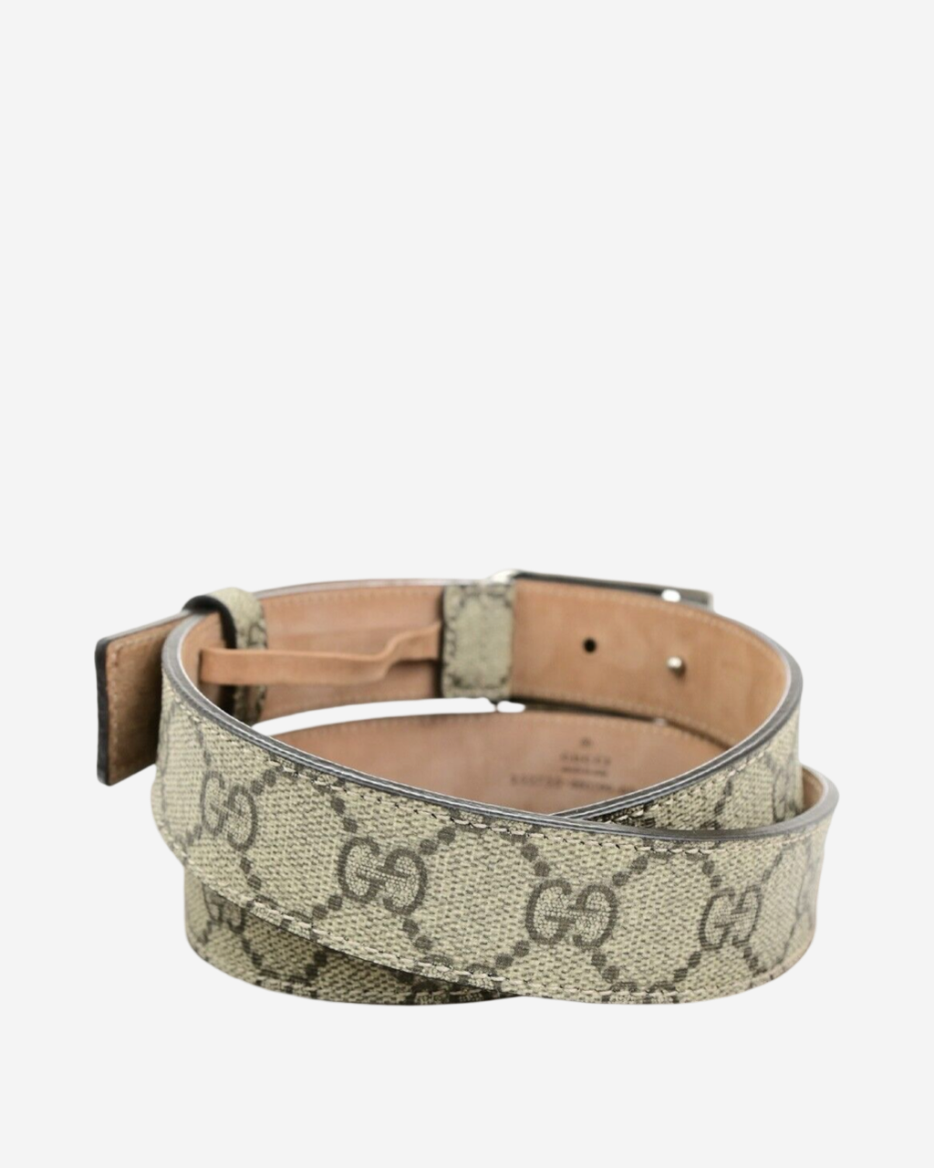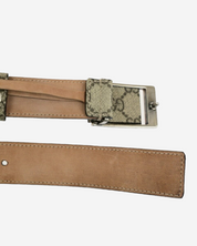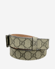- Descripción: Cinturón en piel color beige, hebilla rectangular, grabado interior, hardware en tono plateado