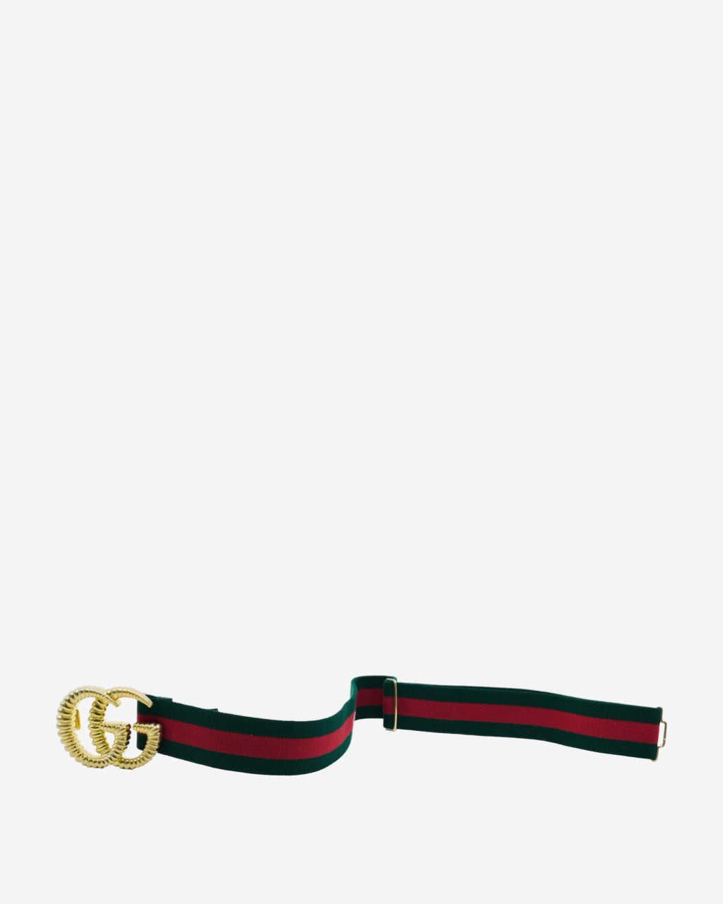 - Descripción: Cinturón Gucci en material textil, ribete característico en tono verde y rojo, placa metálica 'GG' frontal