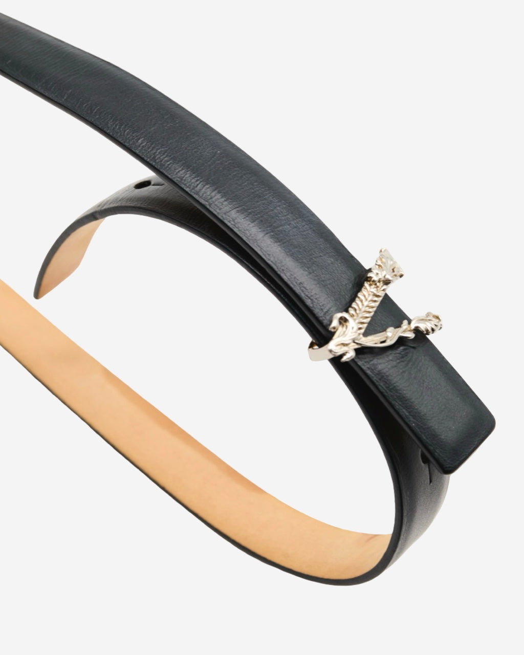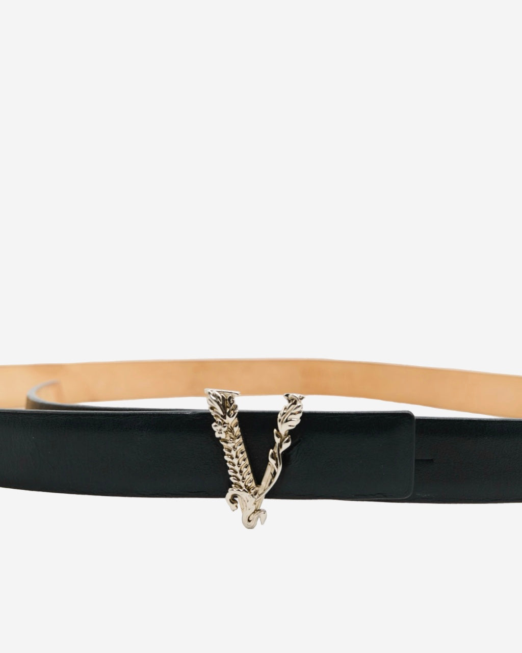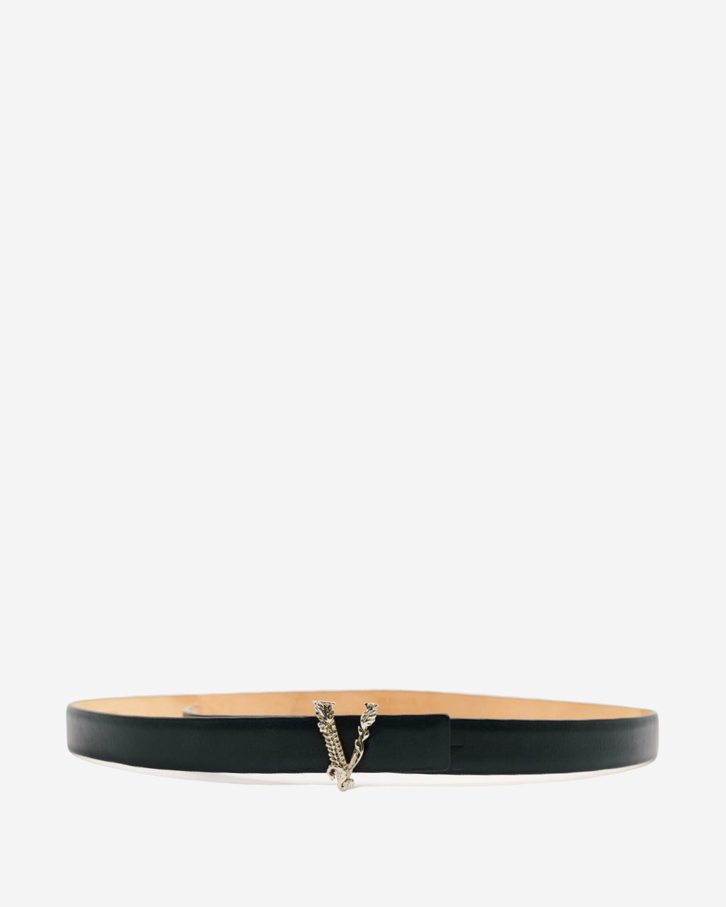 - Descripción: Cinturón de piel Versace en color negro, hebilla en forma de 'V' característica, grabado en el interior, hardware en tono plateado
