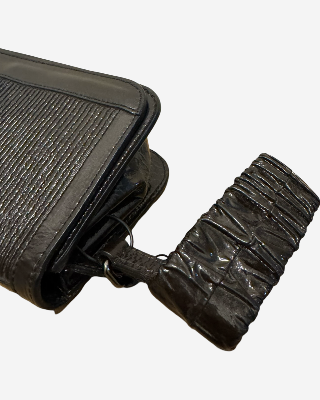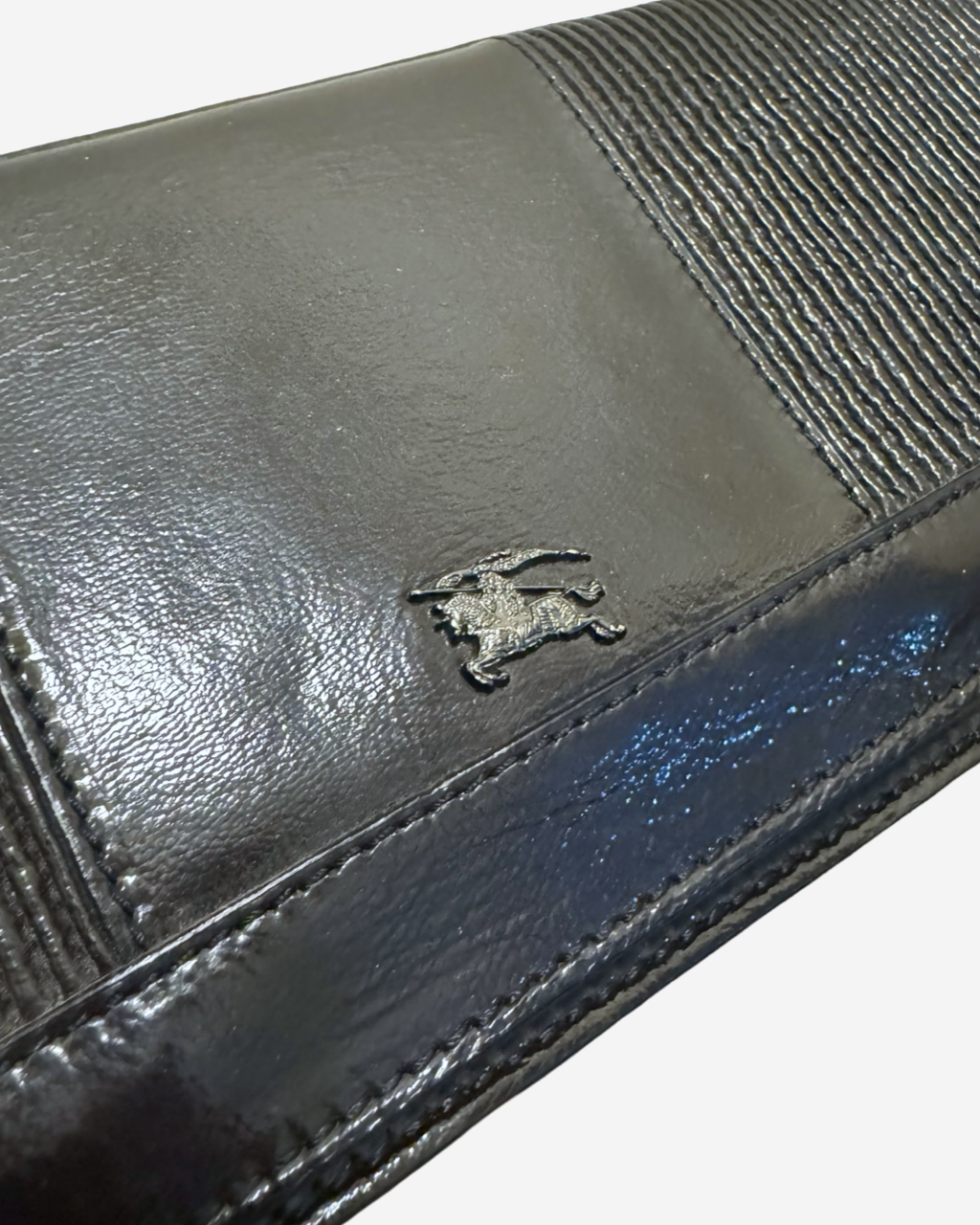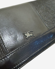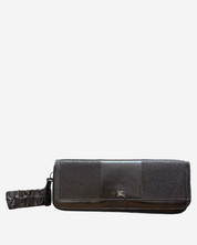 • Descripción: Clutch en piel color negro, ajuste a la muñeca con resorte, hardware color plateado