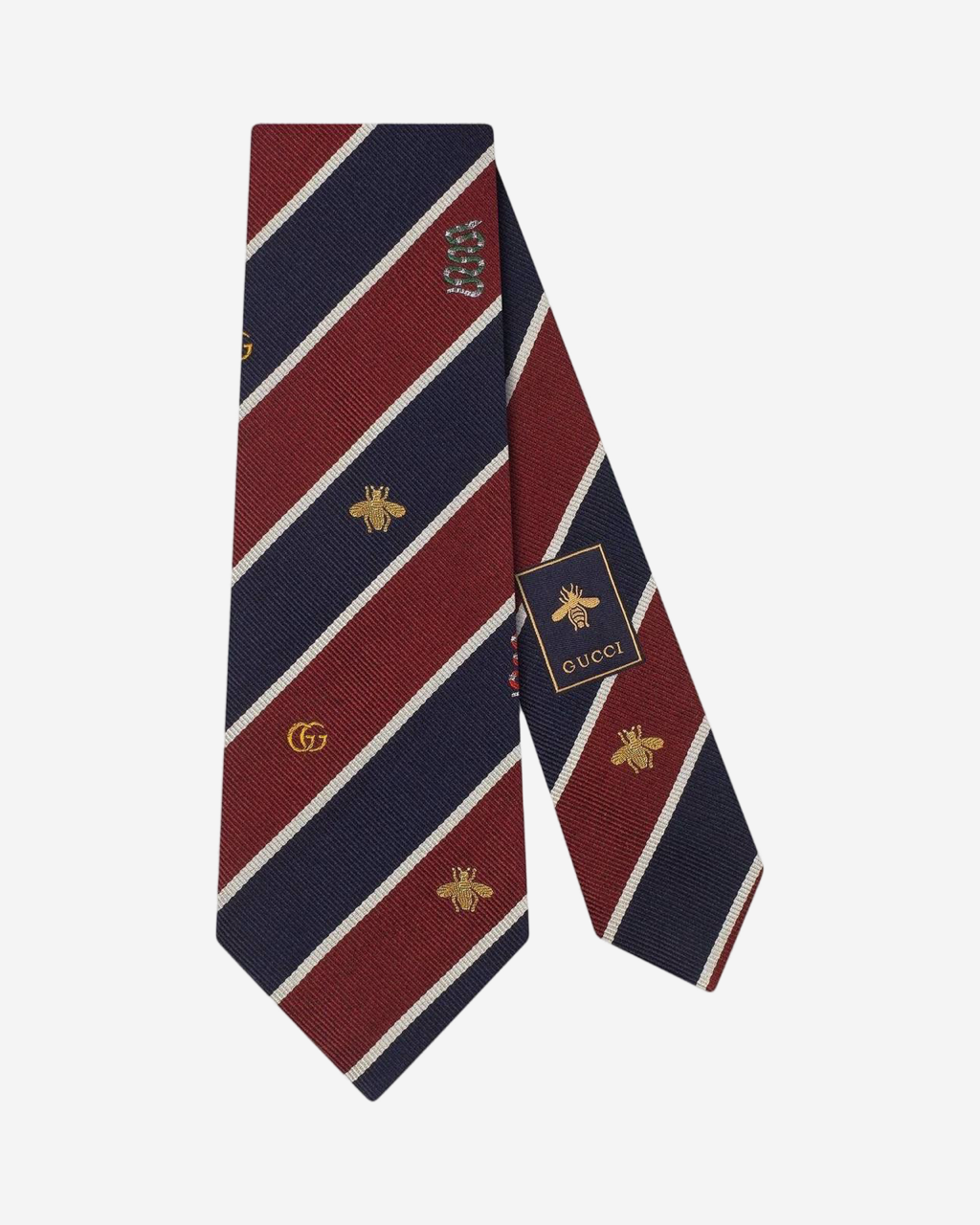 - Descripción: Corbata Gucci con print GG y detalles de serpientes y abejas