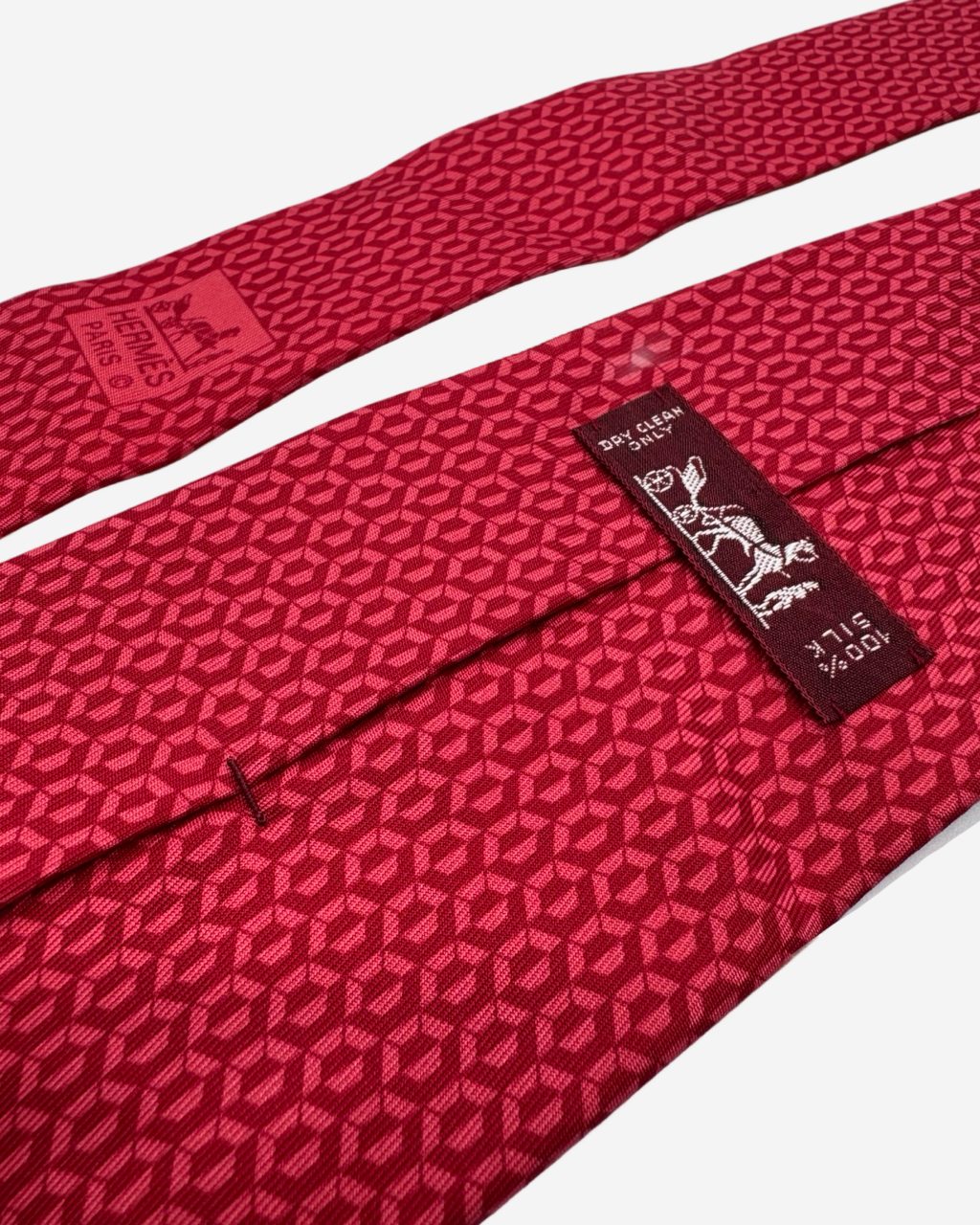 - Descripción: Corbata Hermés con motivo de geométrico en tono rojo, fondo en rosa