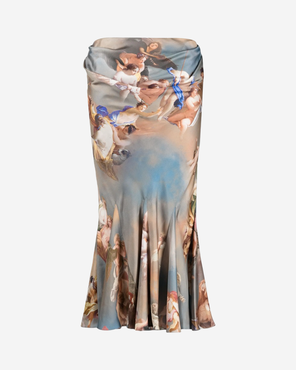 - Descripción: Falda midi en seda con print barroco, ajuste a la cadera, detalle de olanes en la parte inferior
