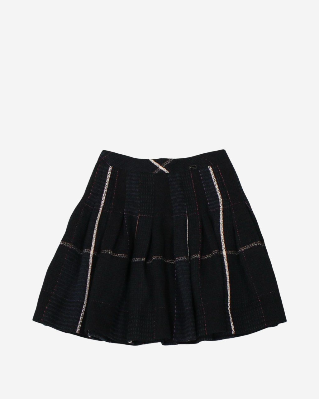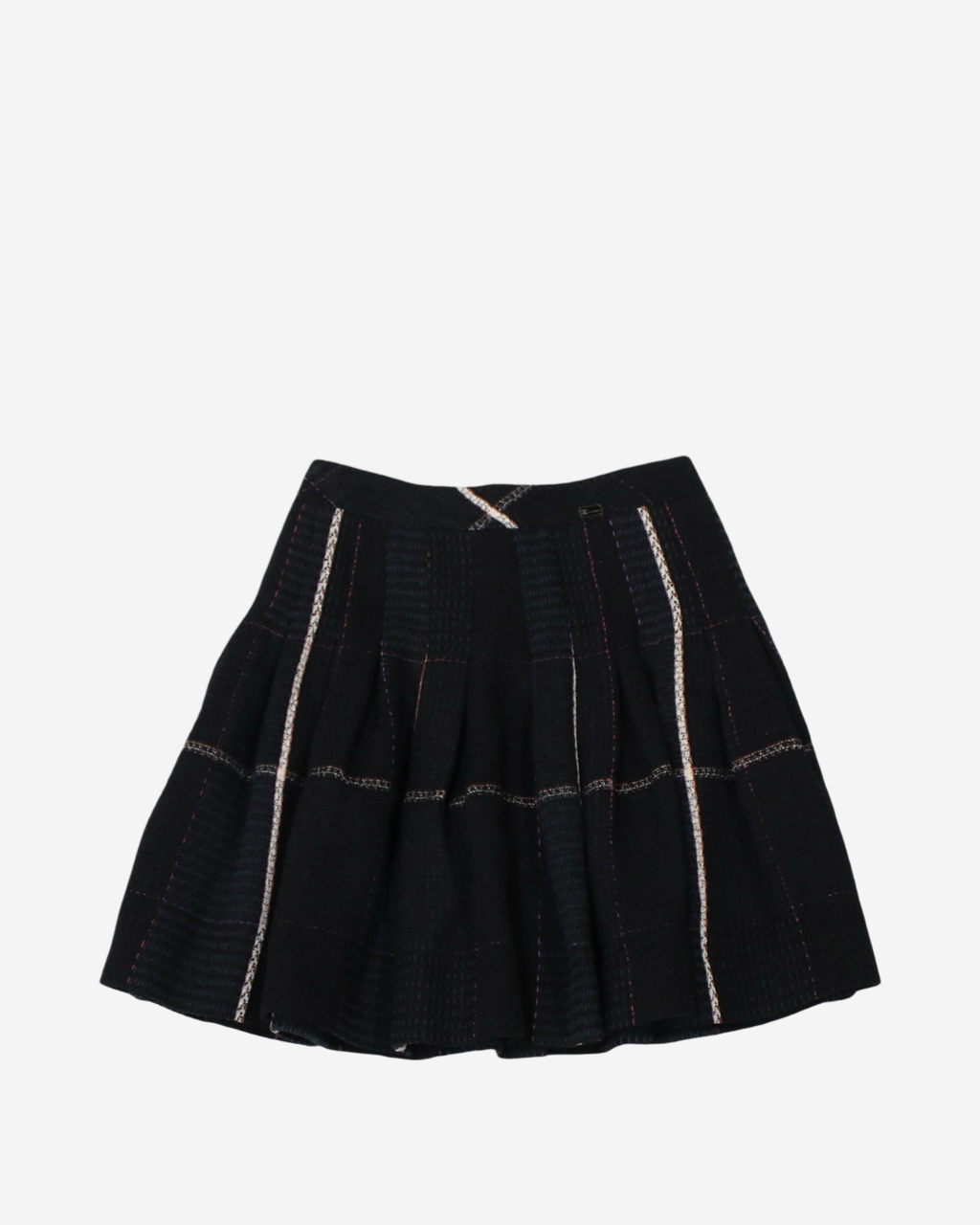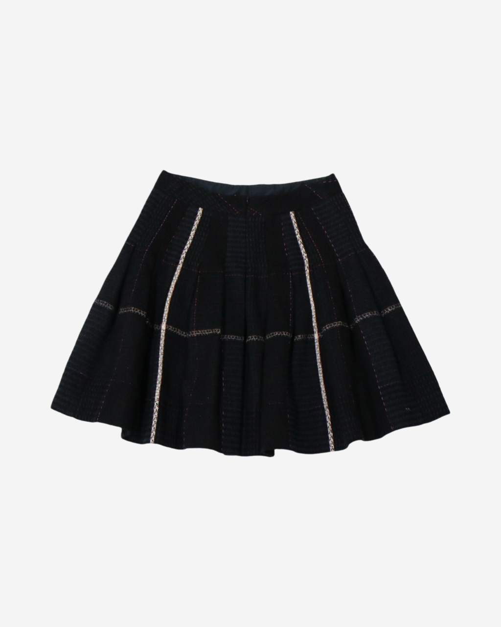 • Descripción: Falda de tweed en color negro con detalles en rosa y beige, corte A, ajuste a la cintura