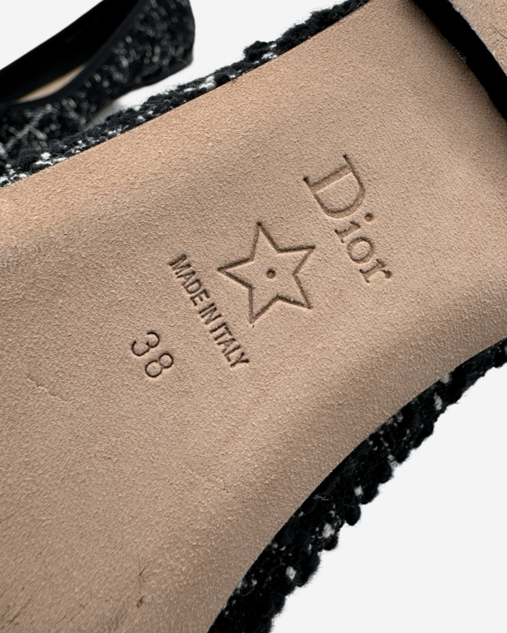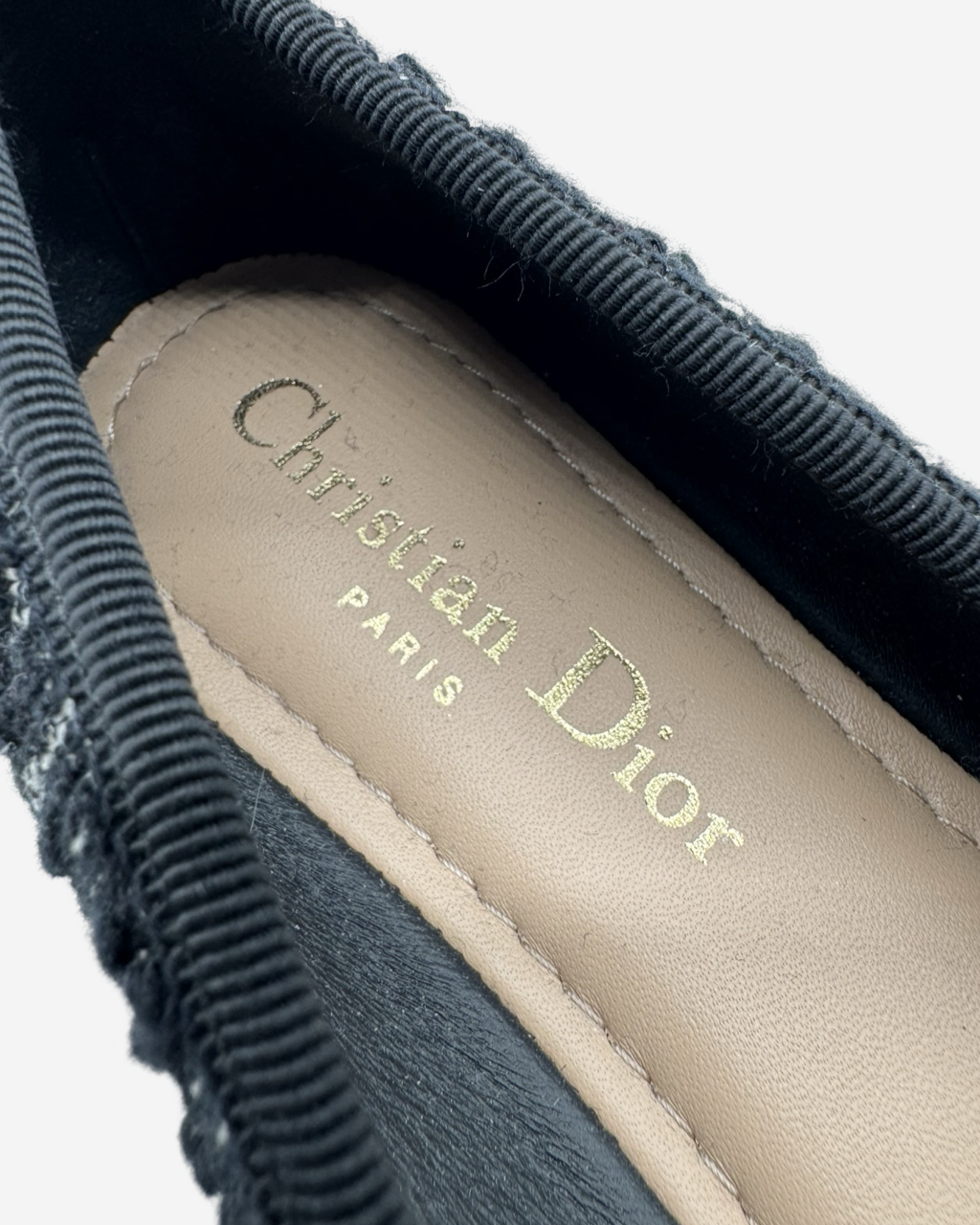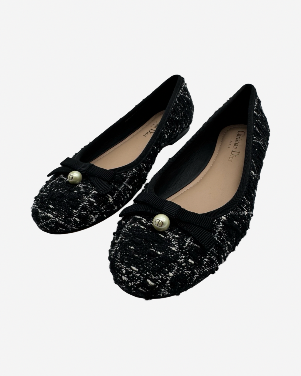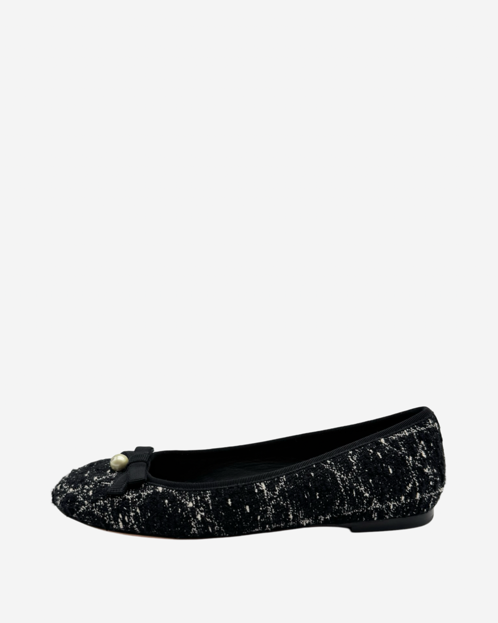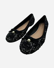 • Descripción: Flats de tweed en color negro con perla frontal, puntera redonda, logo grabado interior