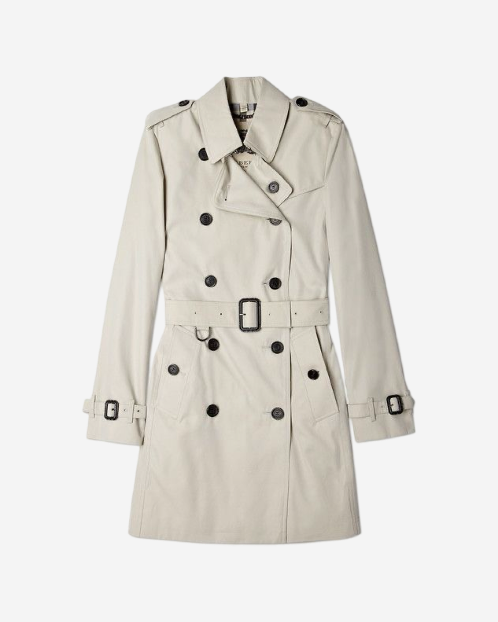 • Descripción: Gabardina con ajuste en botones y cinturón, manga larga, dos bolsillos laterales, largo medio