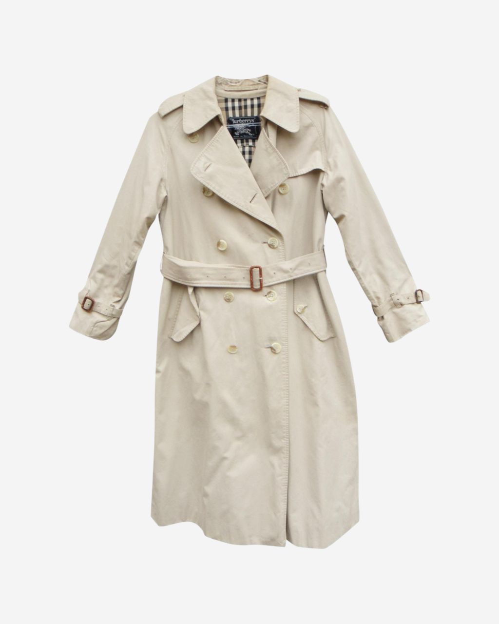 - Descripción: Gabardina con ajuste en botones y cinturón, manga larga, dos bolsillos laterales, largo medio