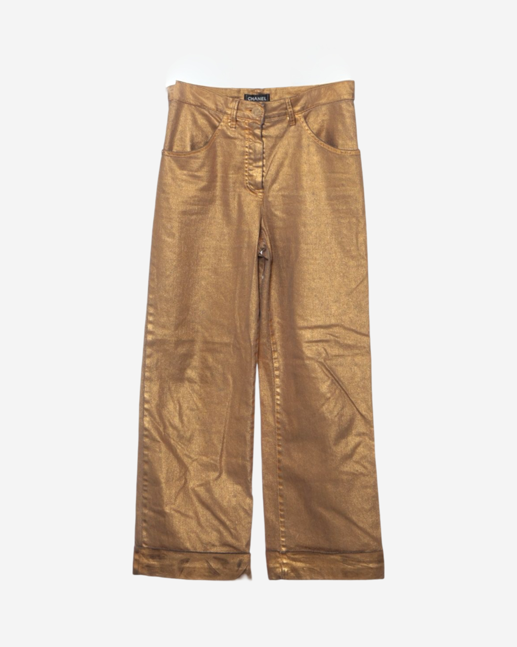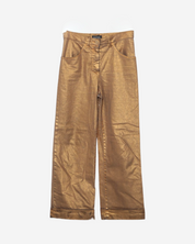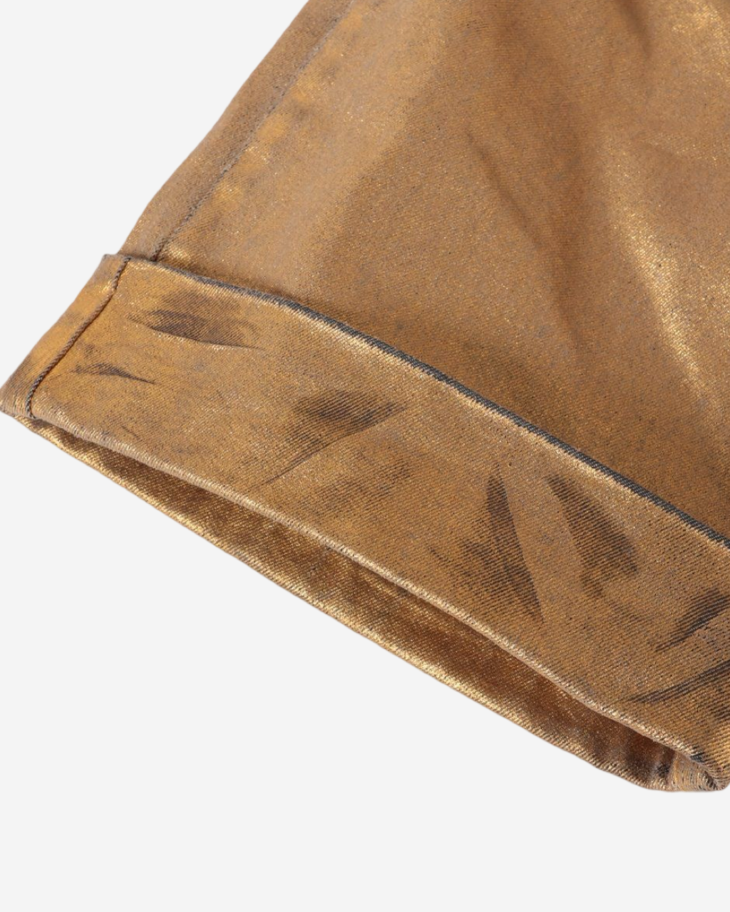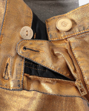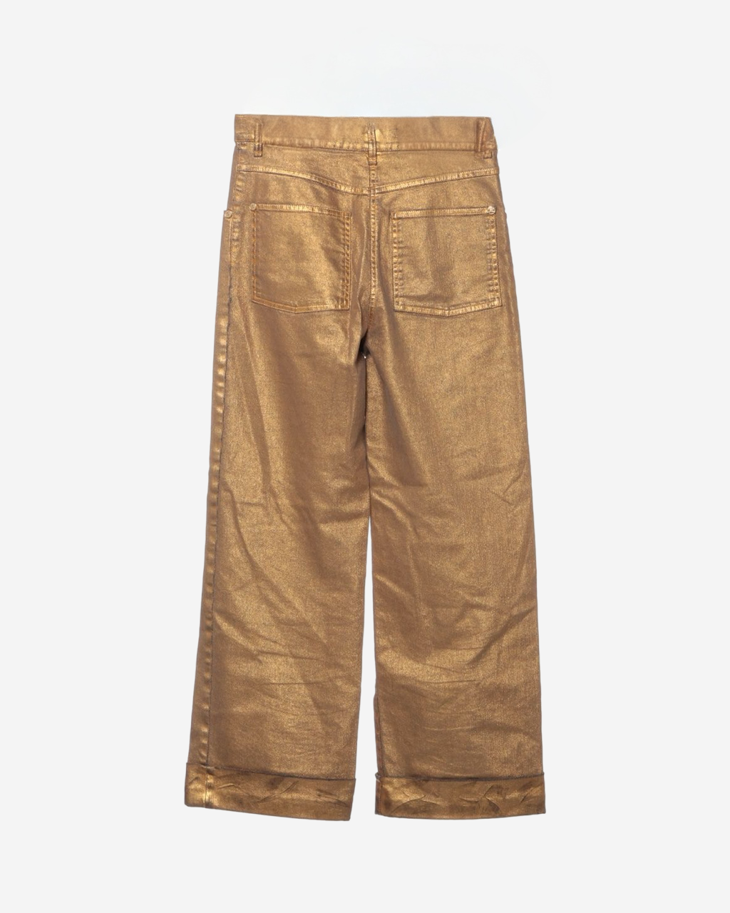 - Descripción: Jeans metálicos en tono dorado, ajuste con botones frontales, corte recto, dobladillo inferior