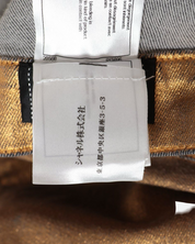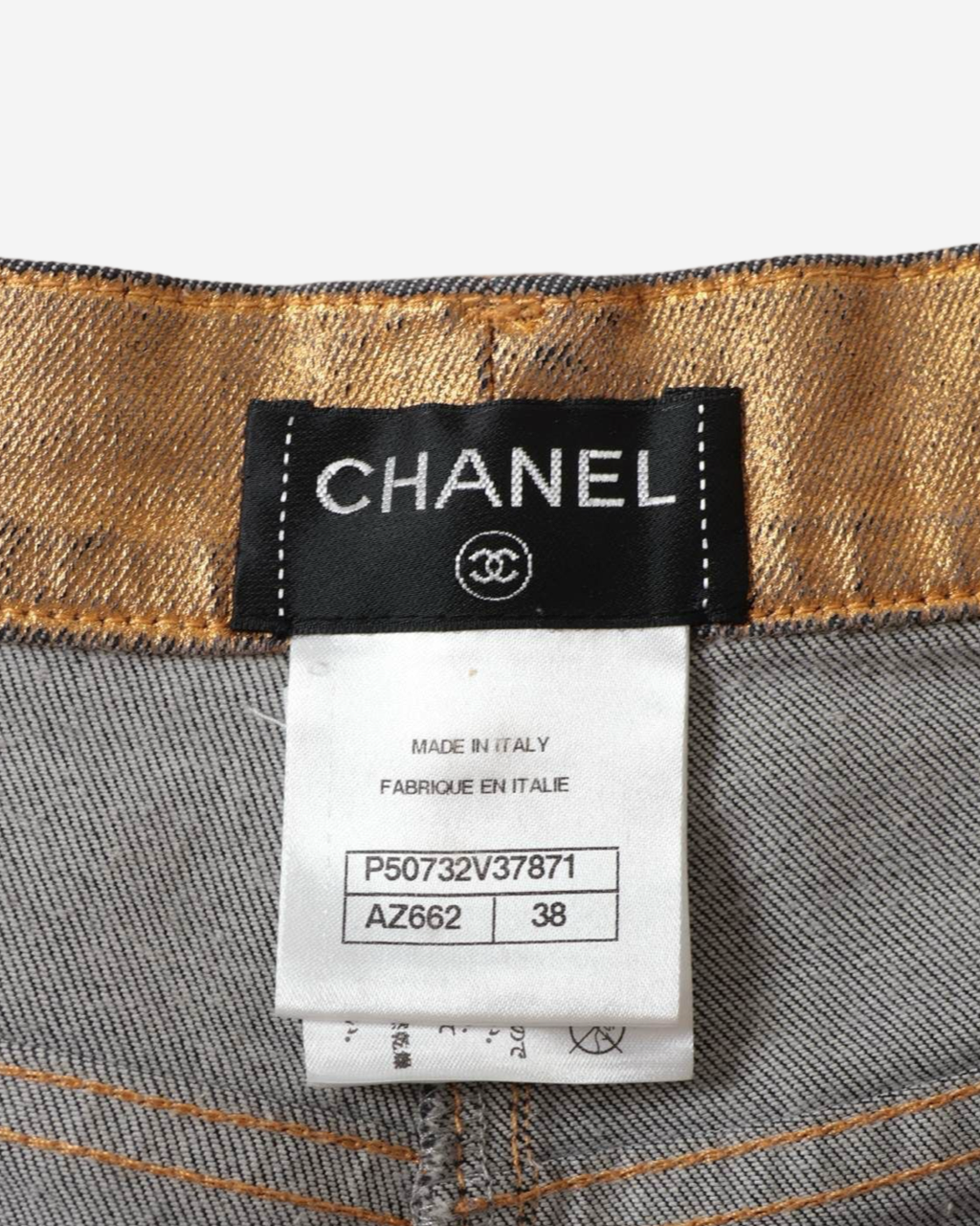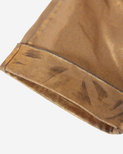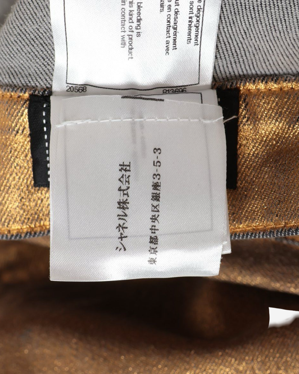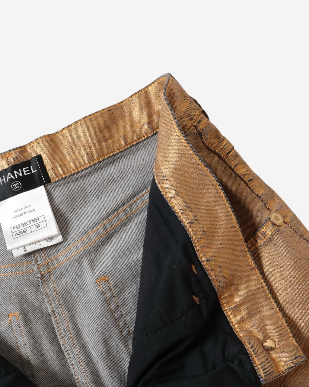 - Descripción: Jeans metálicos en tono dorado, ajuste con botones frontales, corte recto, dobladillo inferior