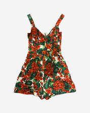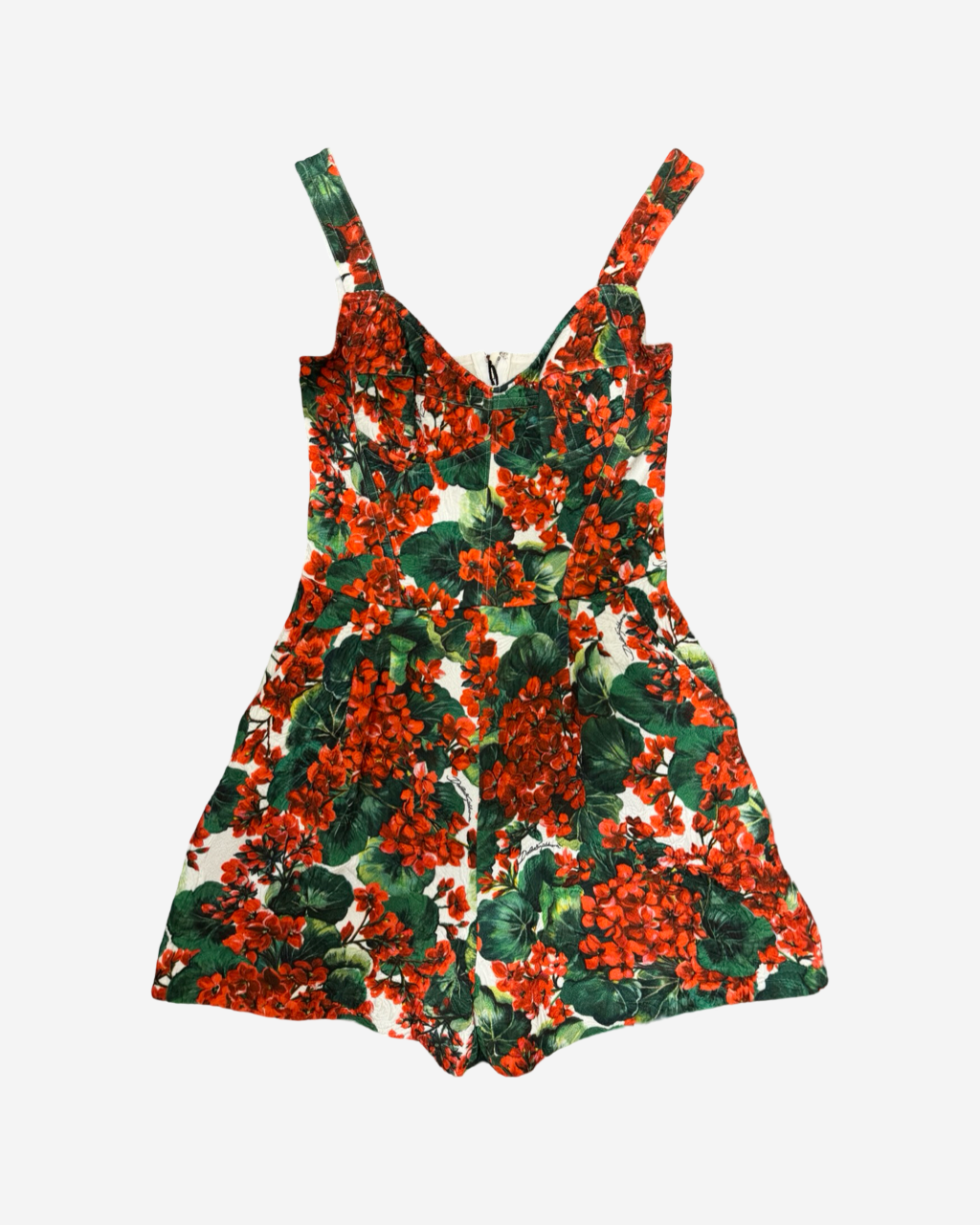 - Descripción: Jumpsuit en print de flores con bordado, cuello de corazón, ajuste con zipper trasero