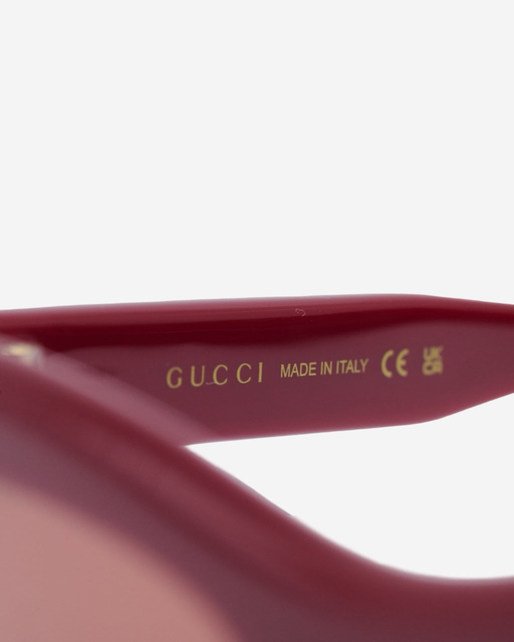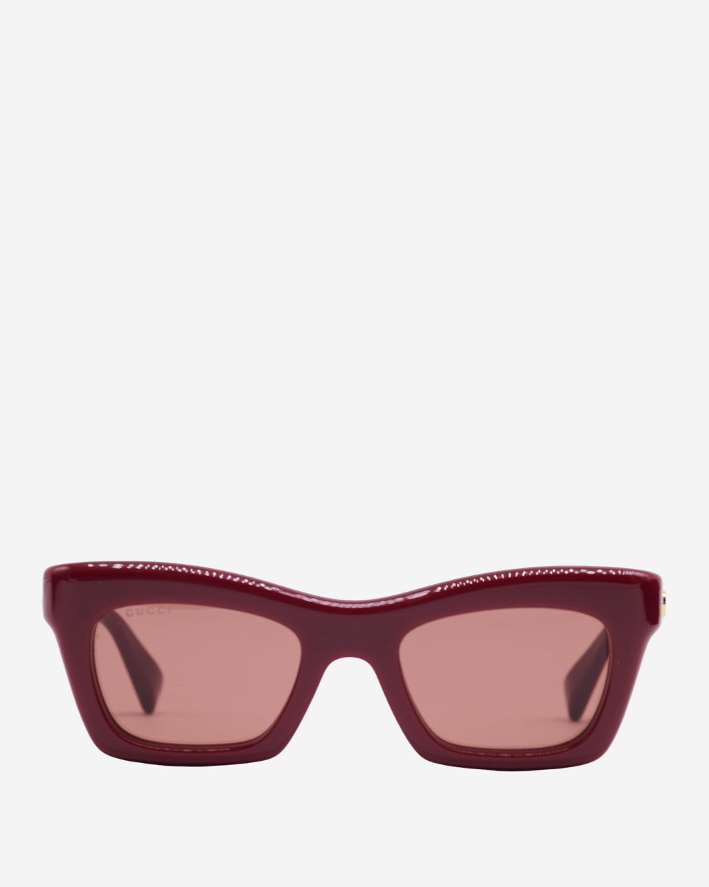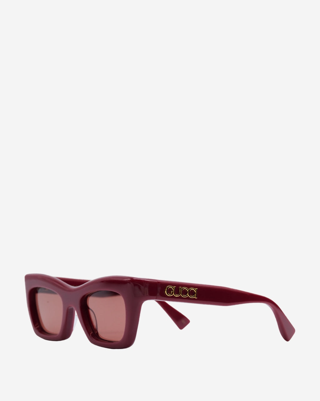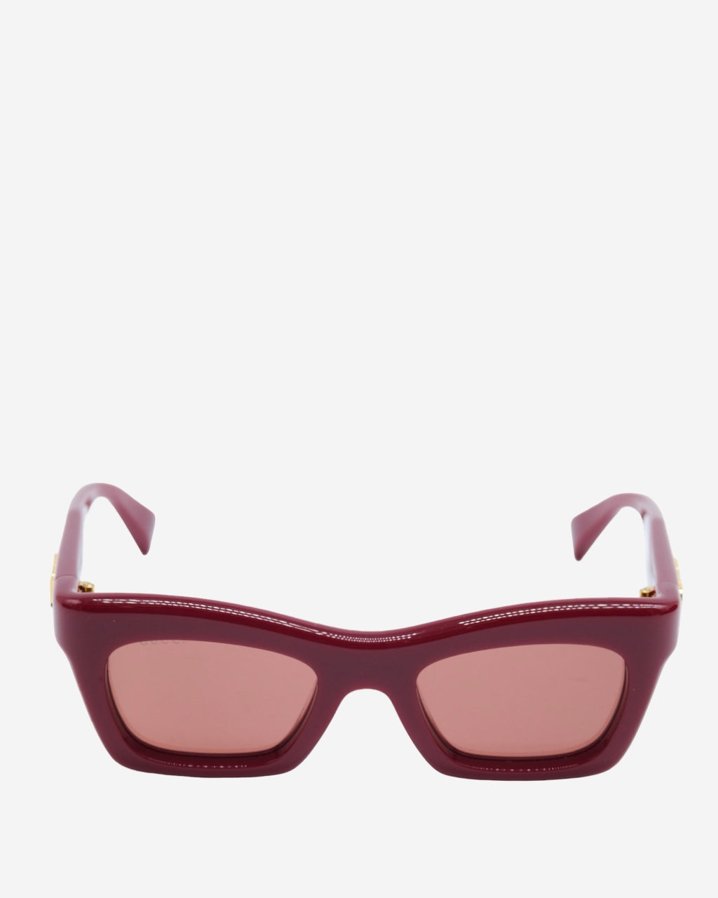 - Descripción: Lentes de sol en acetato color vino, forma semi cuadrada, placa de logo característica en los laterales, hardware en tono dorado