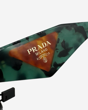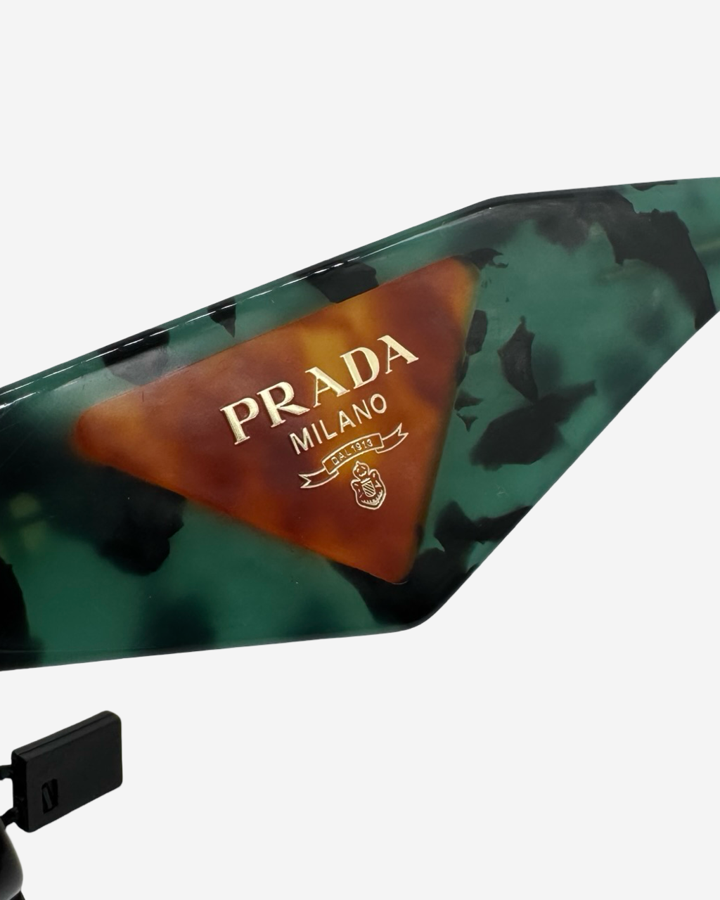 - Descripción: Lentes de sol prada en plástico color negro, logo característico en los laterales y fondo en color azul mármol, hardware color plateado