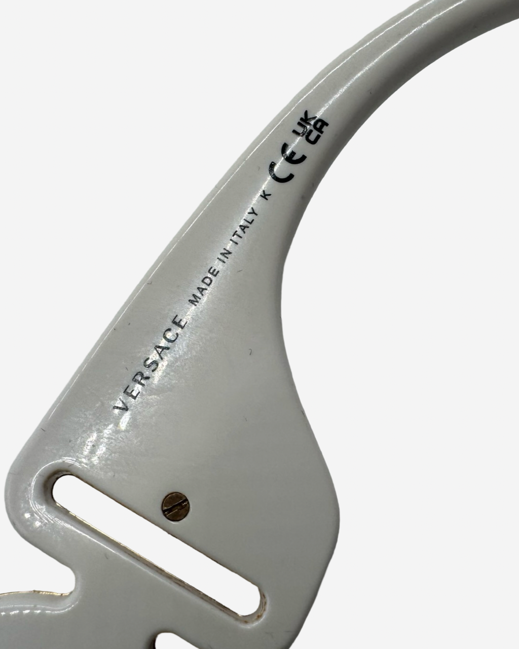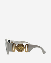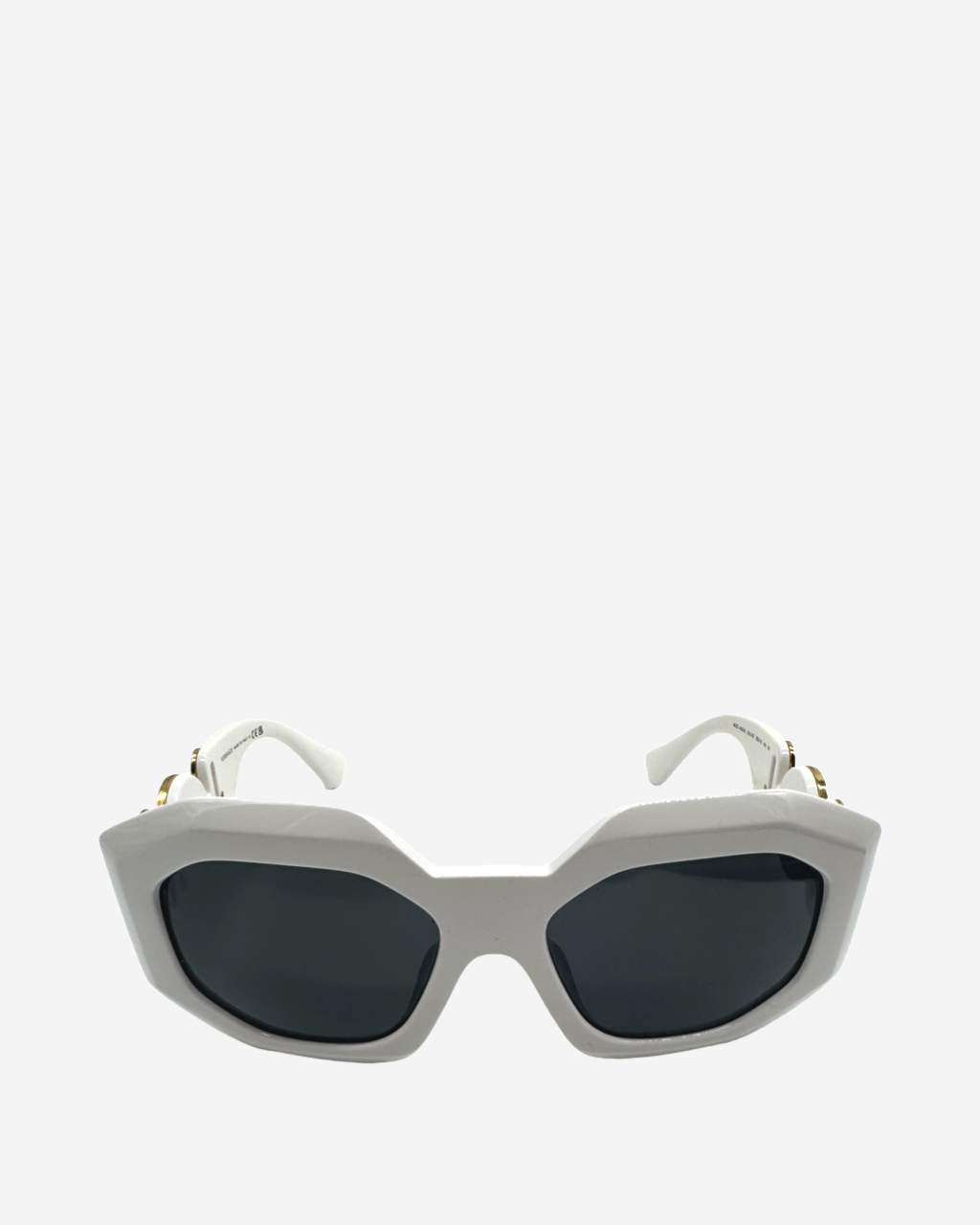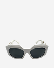 - Descripción: Lentes de sol en acetato color blanco, oversized, placa de medusa en los laterales, logo grabado interior, harwdare color dorado