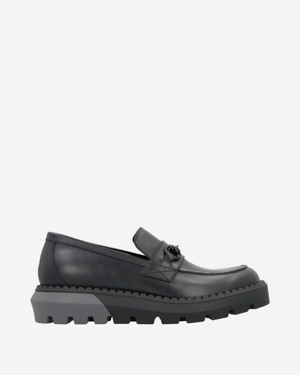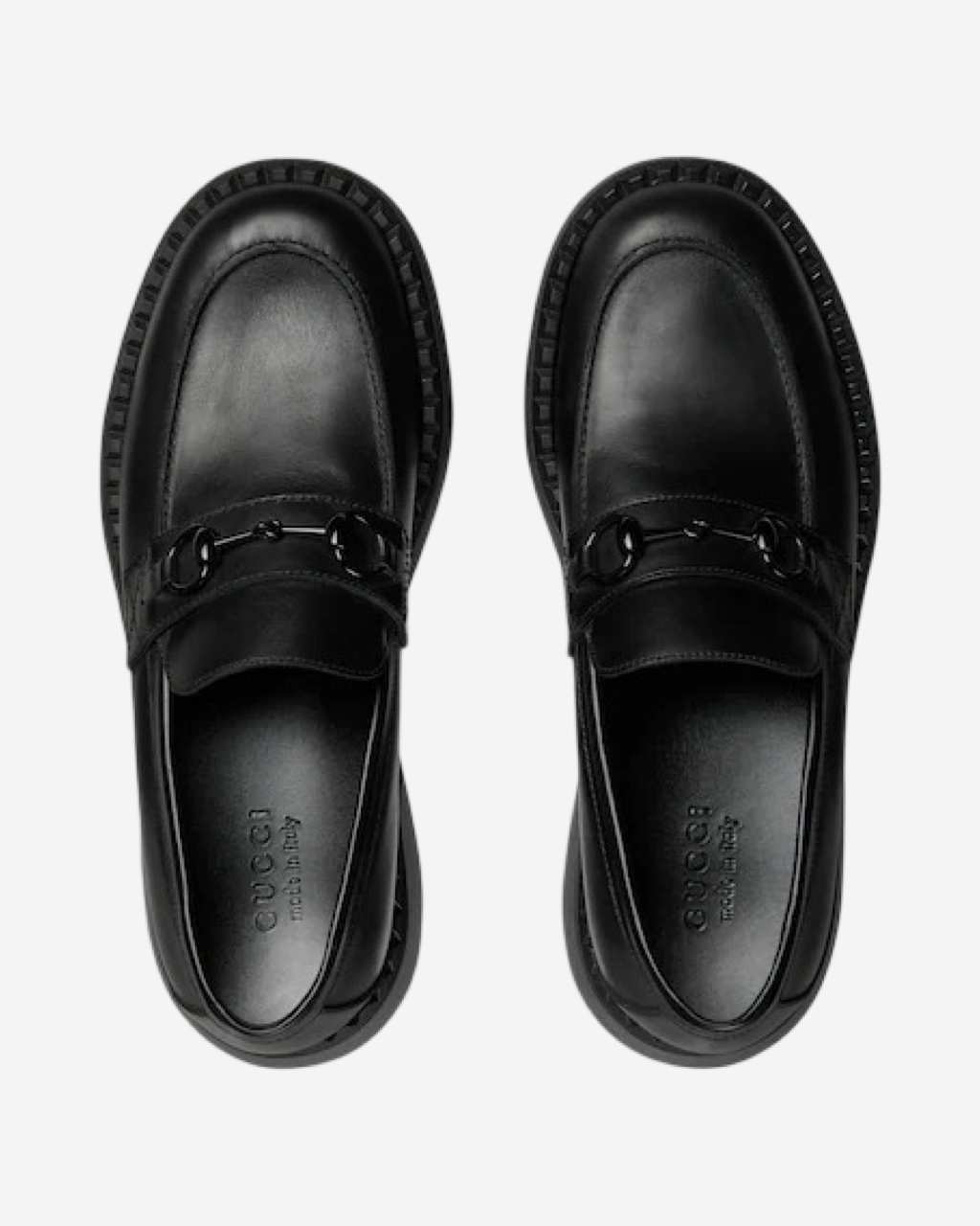 - Descripción: Loafers en piel color negro, placa horsebit característica, puntera redondeada, suela en goma chunky
