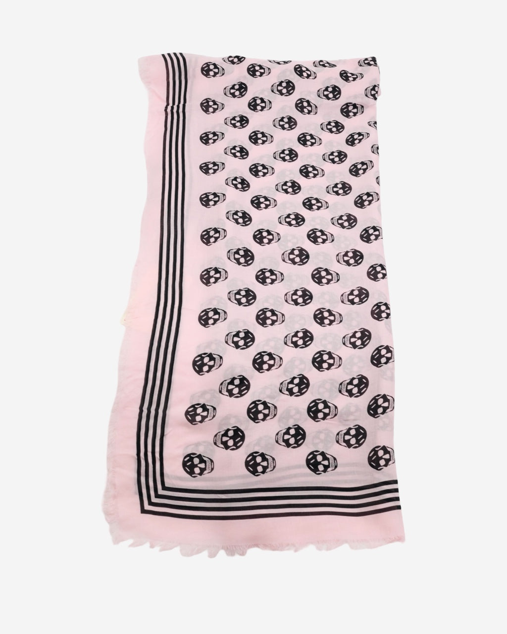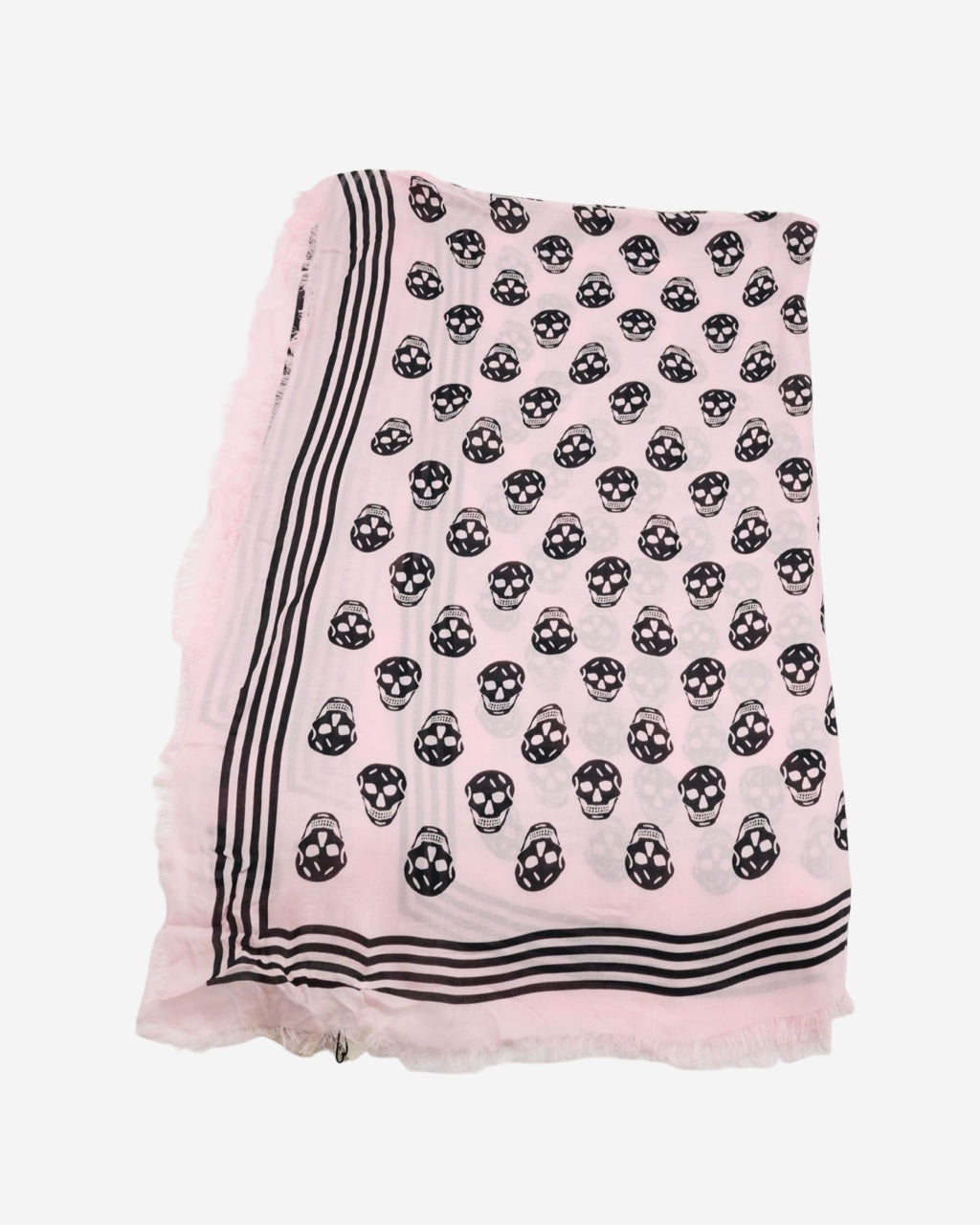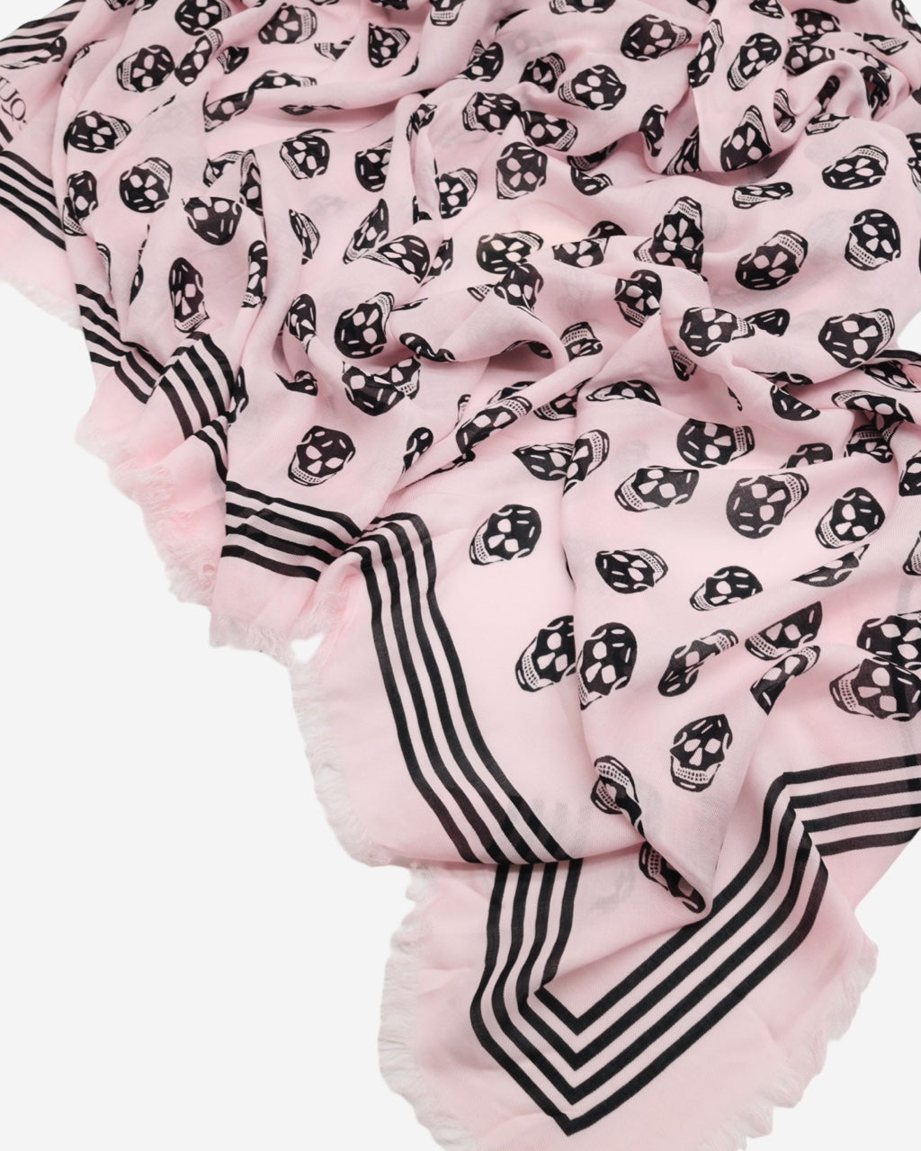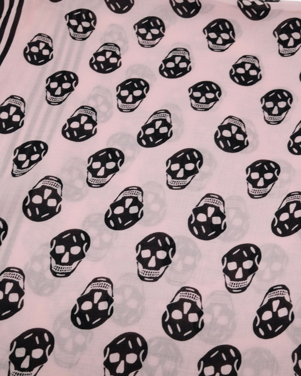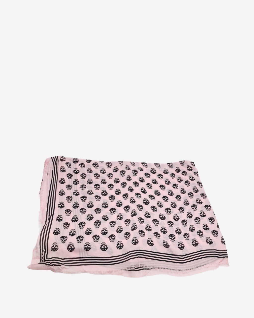 - Descripción: Mascada Alexander McQueen en color rosa con motivo de skulls en color negro, fringe en los laterales