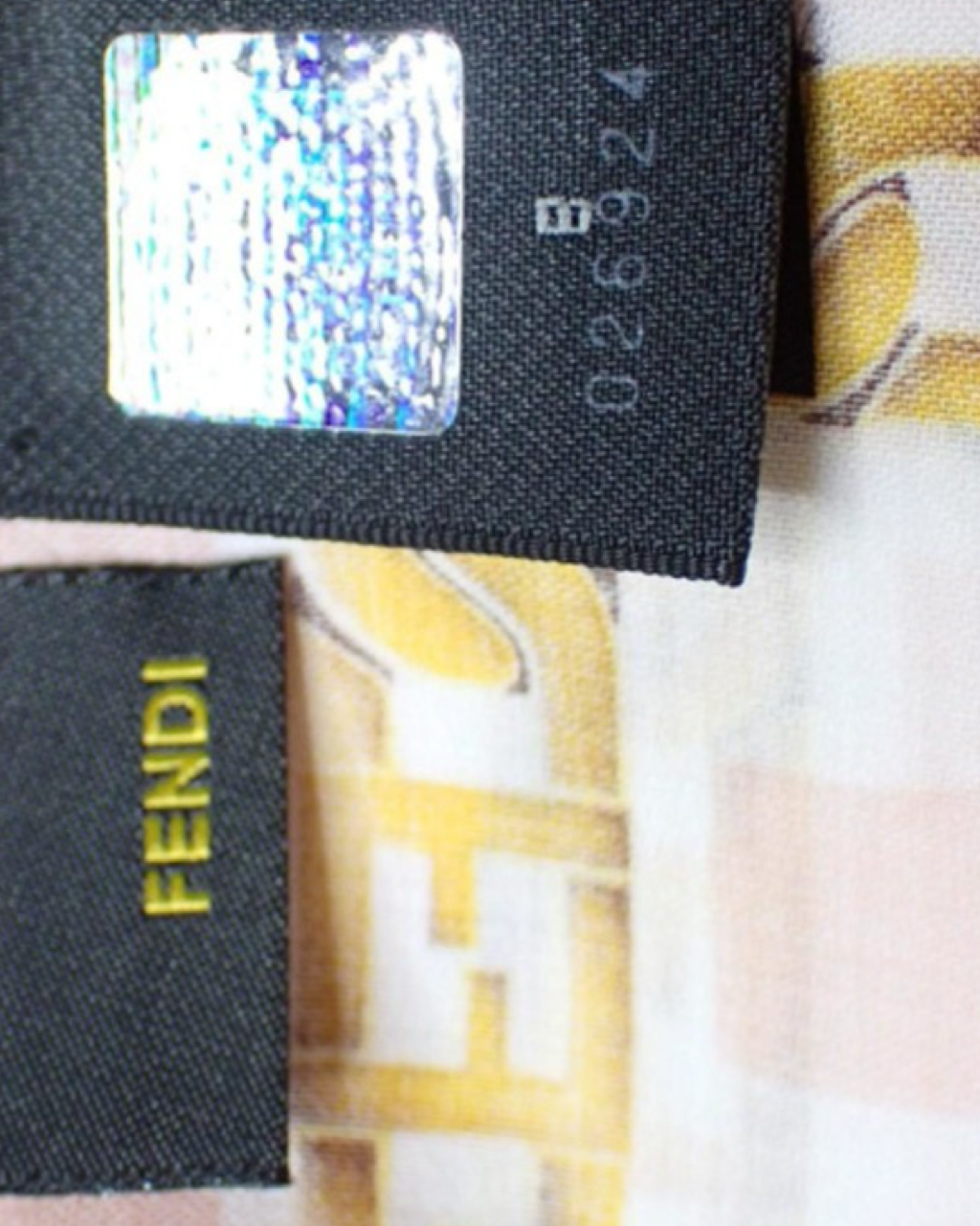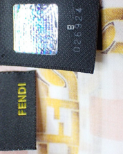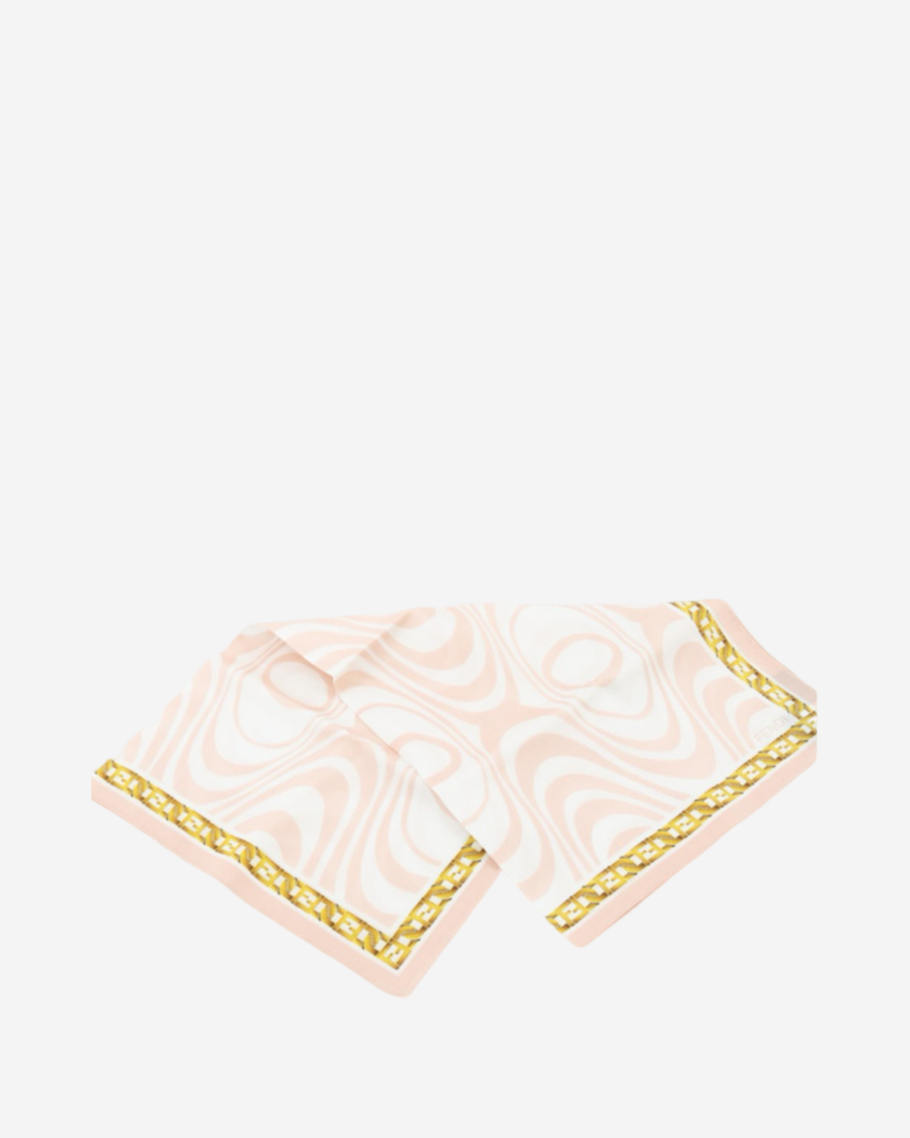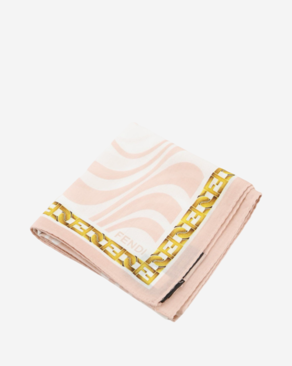 • Descripción: Mascada cuadrada Fendi en seda color rosa con motivo barroco en tonos dorados