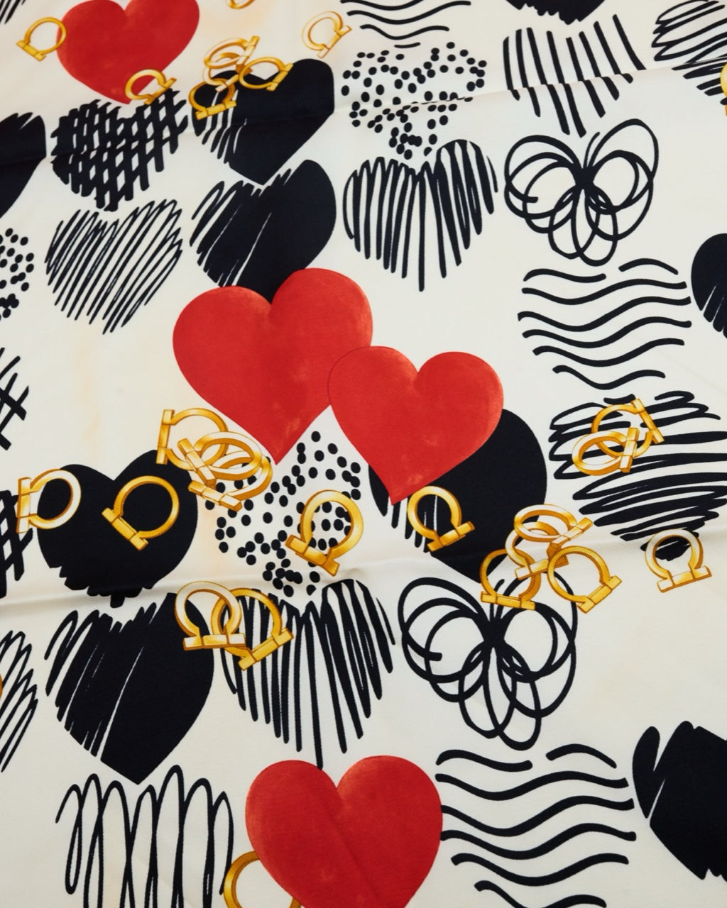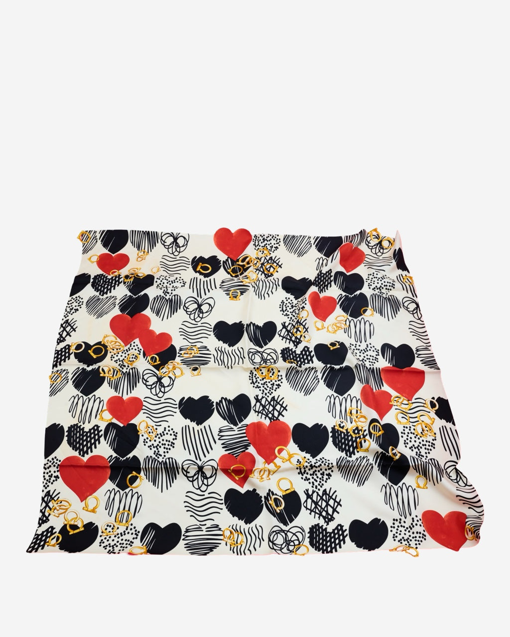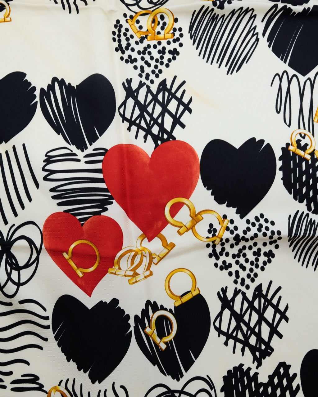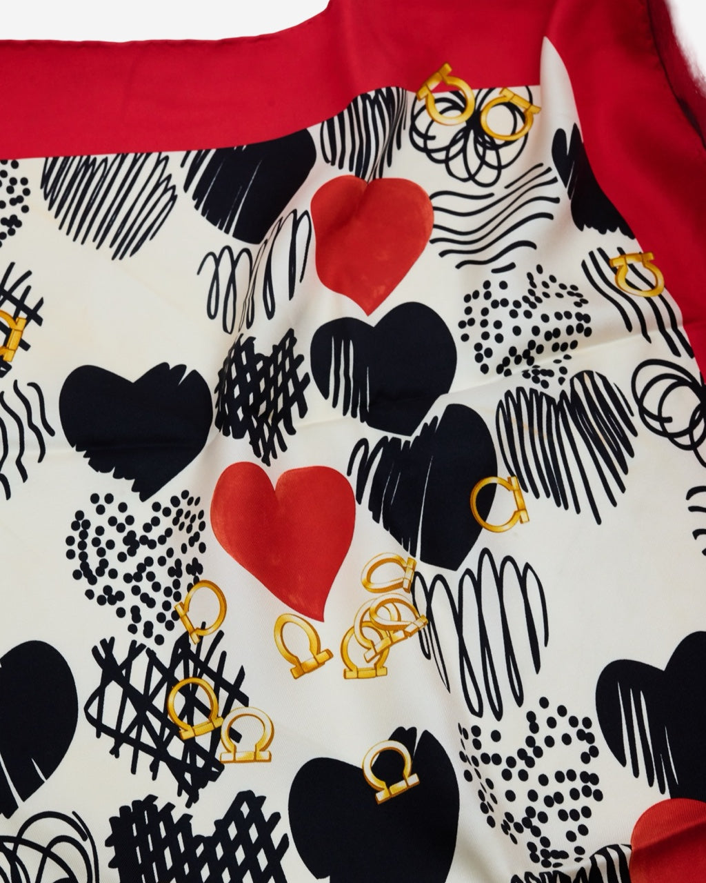 - Descripción: Mascada Ferragamo en color beige con motivo de gancini en tono dorado, contorno rojo