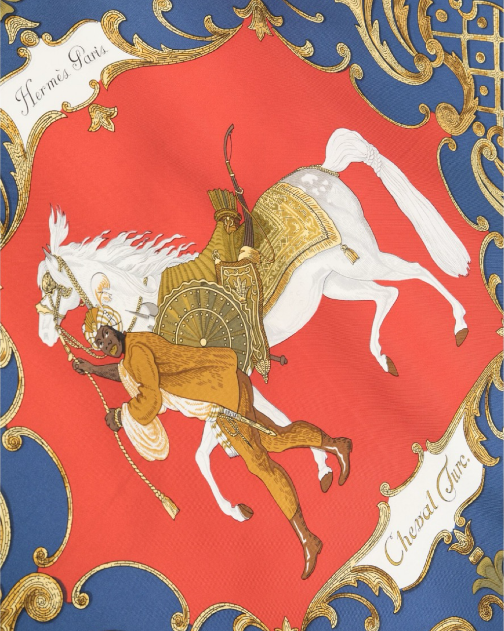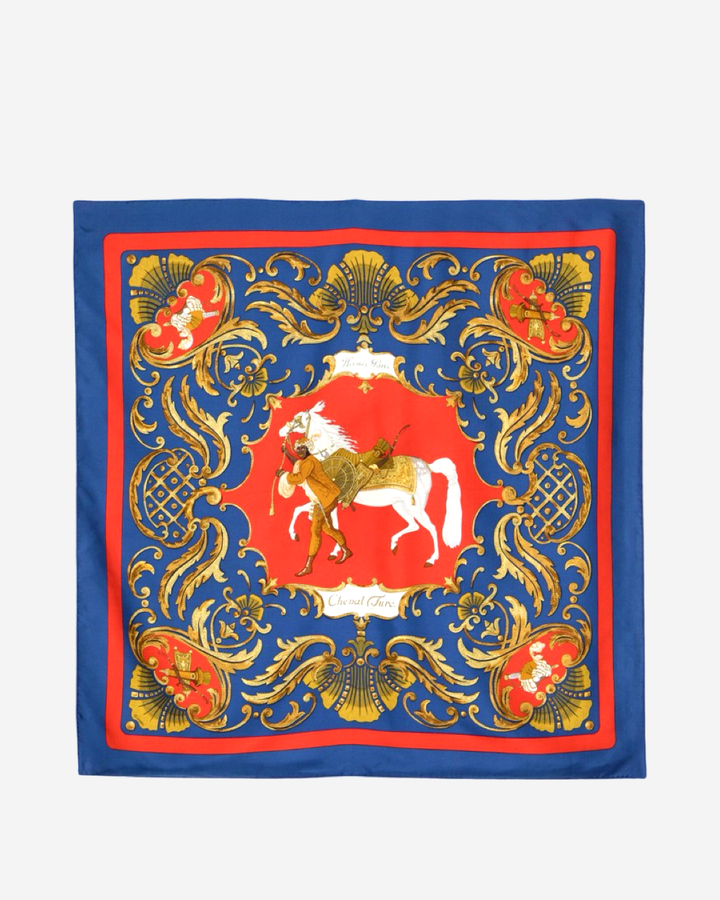 - Descripción: Mascada en color azul con detalles barrocos y jinetes