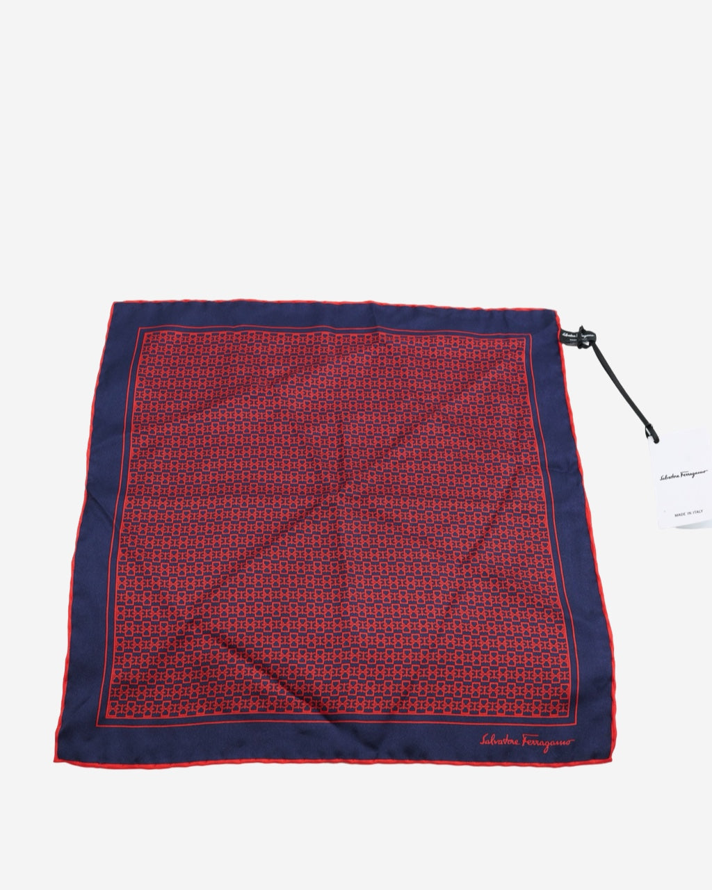 - Descripción: Pañuelo Ferragamo en seda color rojo, contornos en tonos azules, forma cuadrada, pequeño