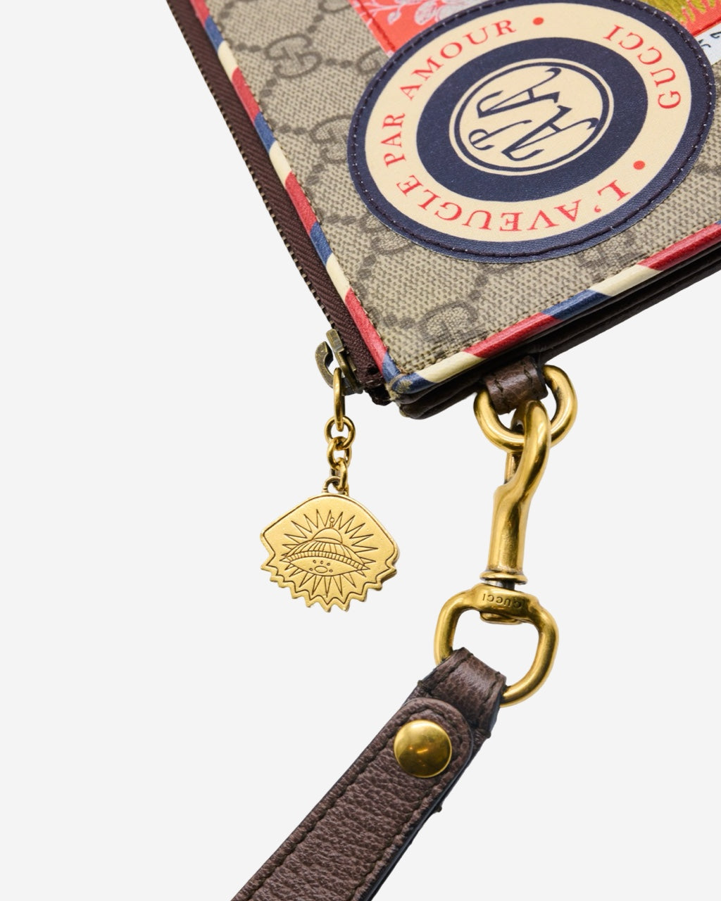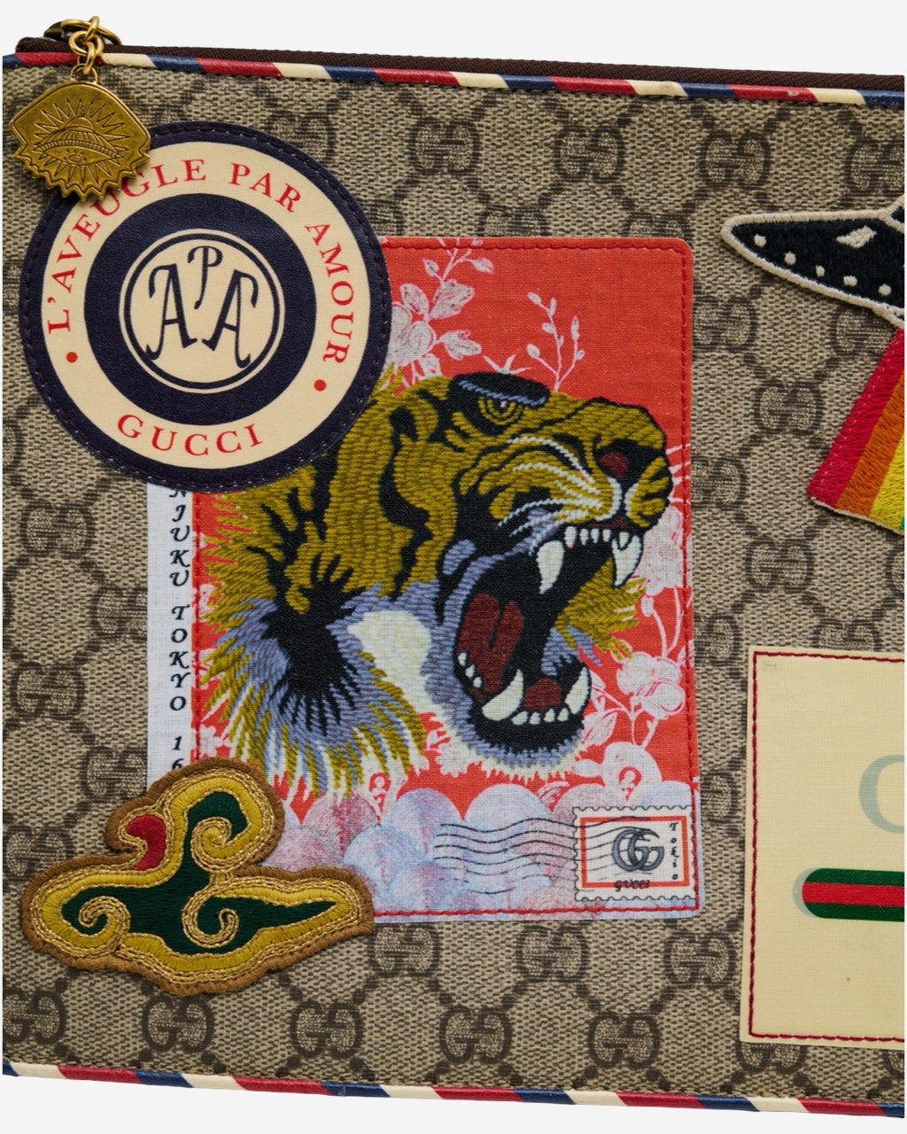 - Descripción: Pouch Gucci en canvas GG Supreme, motivo de patches bordados, abertura con cierre de doble sentido, forro interior textil, compartimentos en el interior, hardware en tono dorado