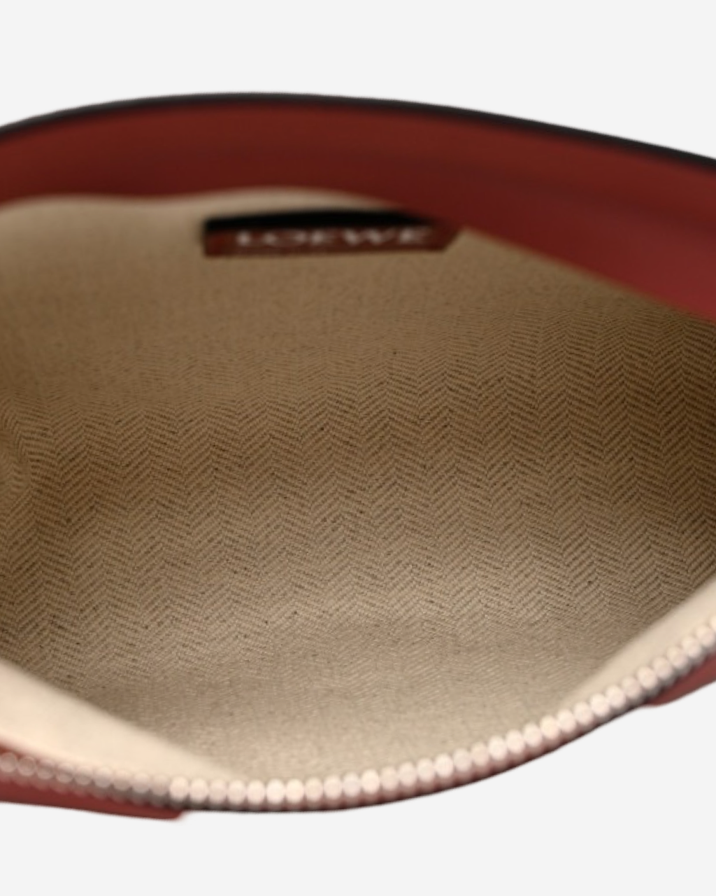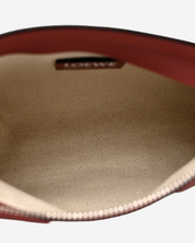 - Descripción: Pouch de mano en piel color rojo, zipper frontal, logo grabado, hardware en tono plateado