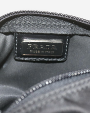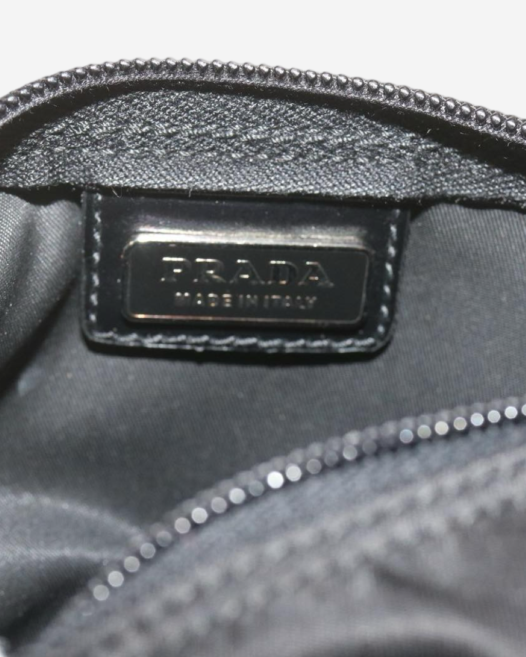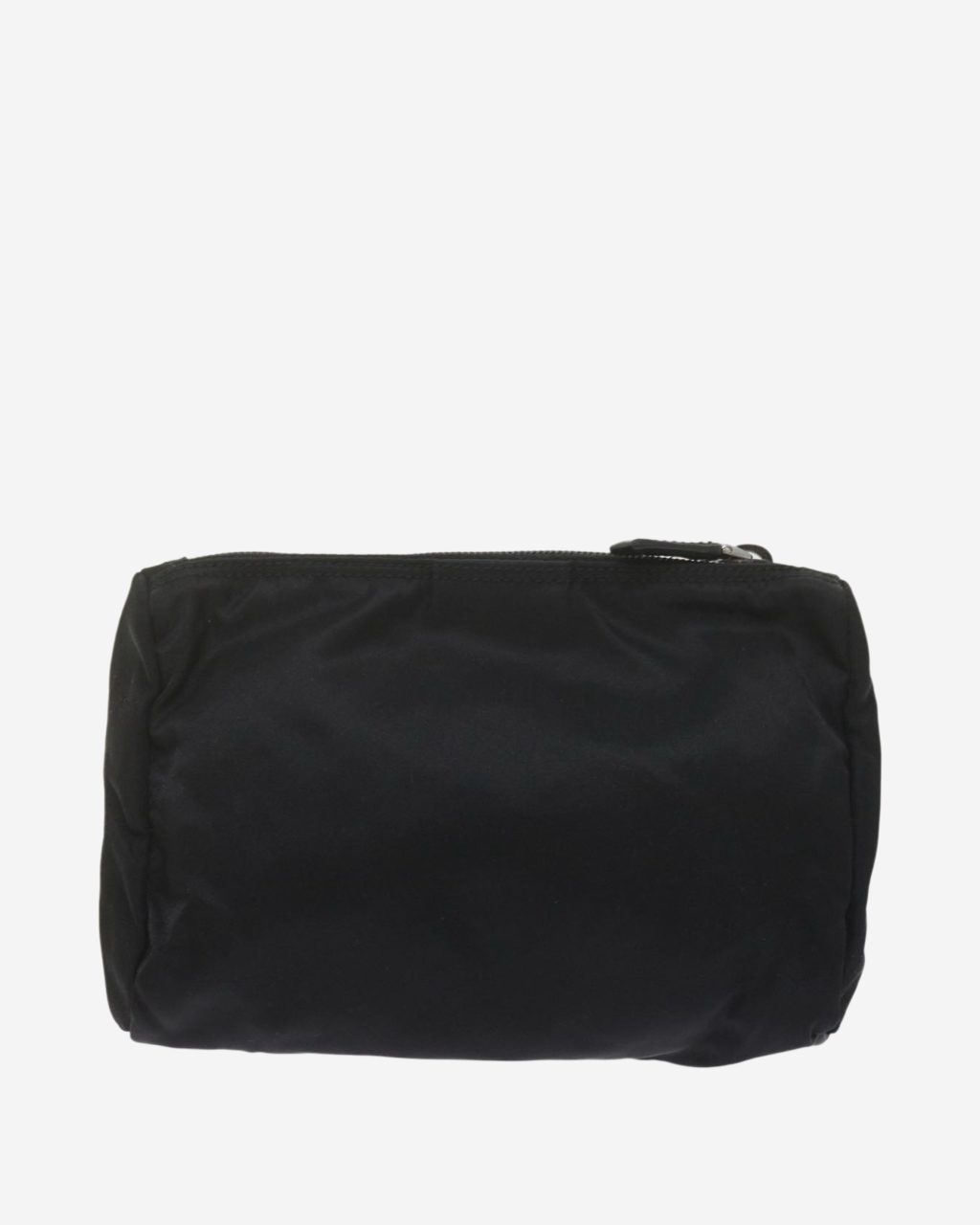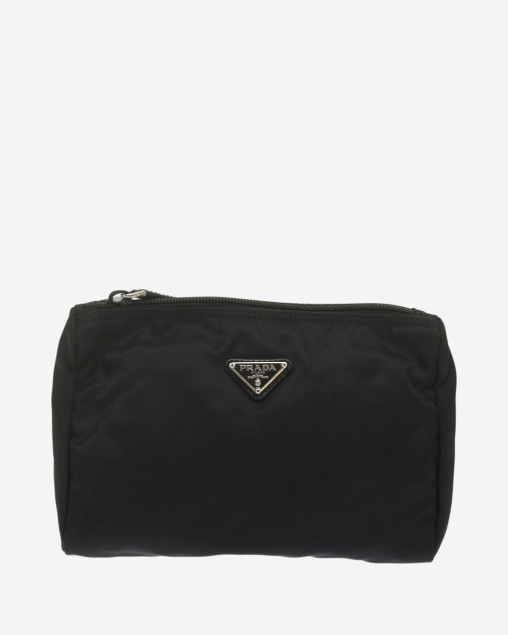 - Descripción: Pouch con cierre al tope, placa trinagular característica, forro interior en nylon, hardware color plateado