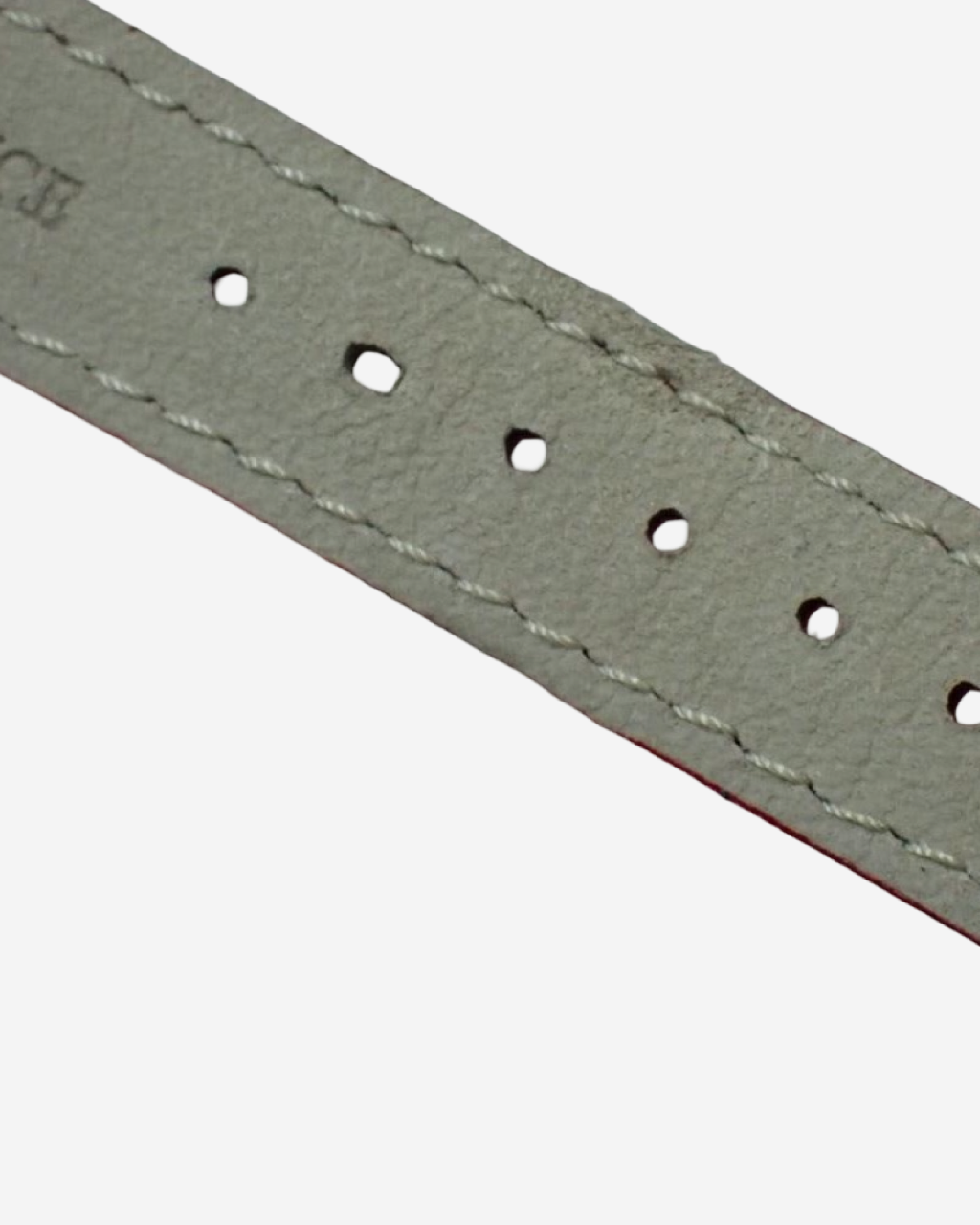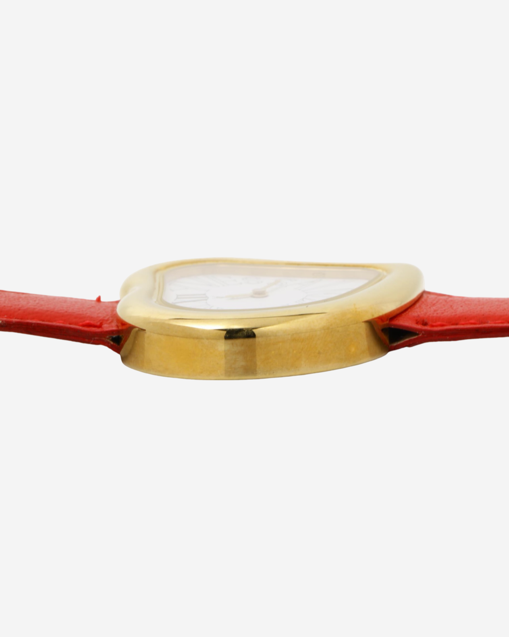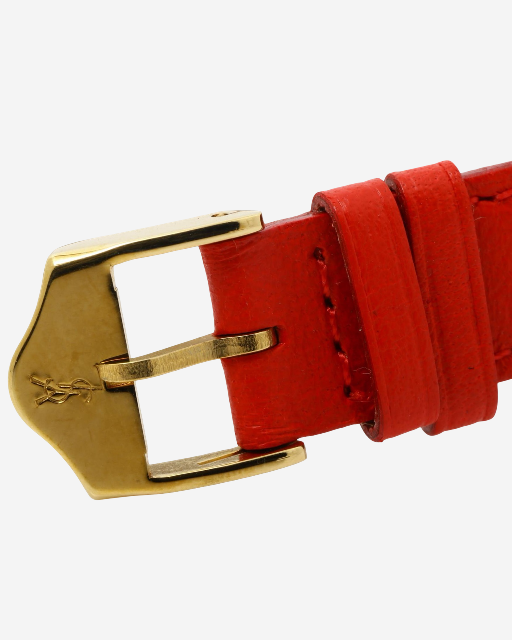 - Descripción: Reloj Saint Laurent en acero inoxidable, forma de corazón con baño de oro, logo en el interior, no resistente al agua, correa de piel en color rojo con broche metálico, modelo 04 F 58375