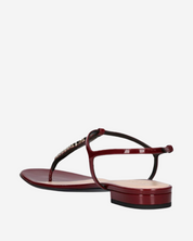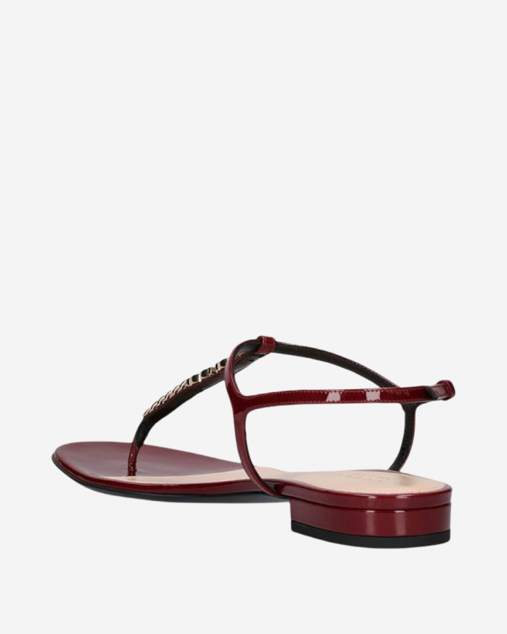 - Descripción: Sandalias planas en charol color vino, placa de logo frontal, ajuste con strap al tobillo, hardware color dorado
